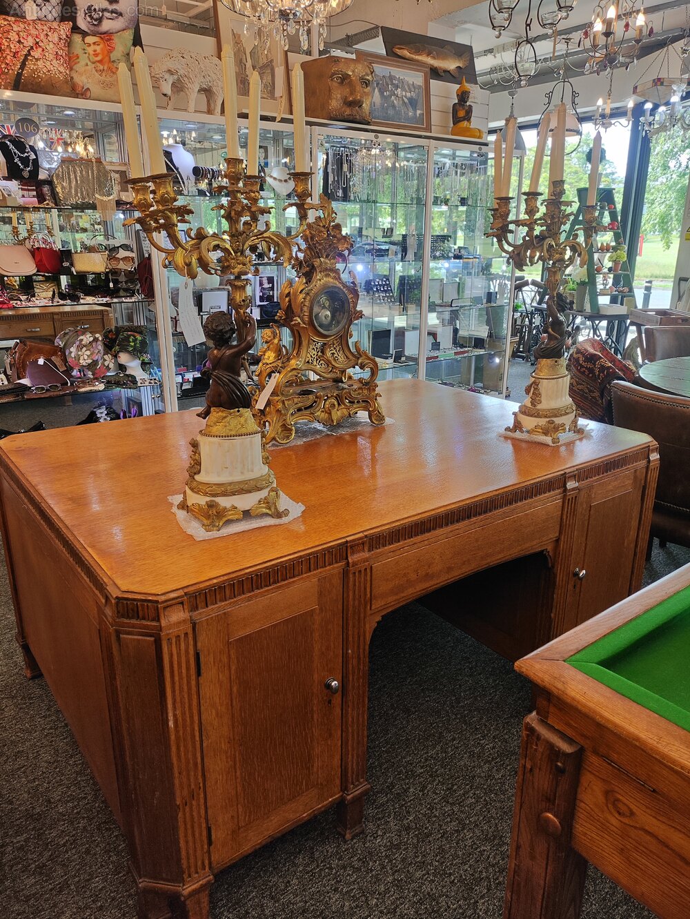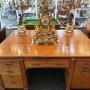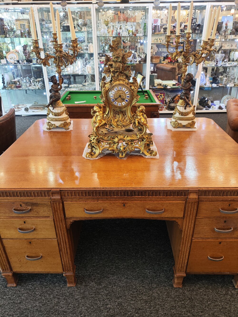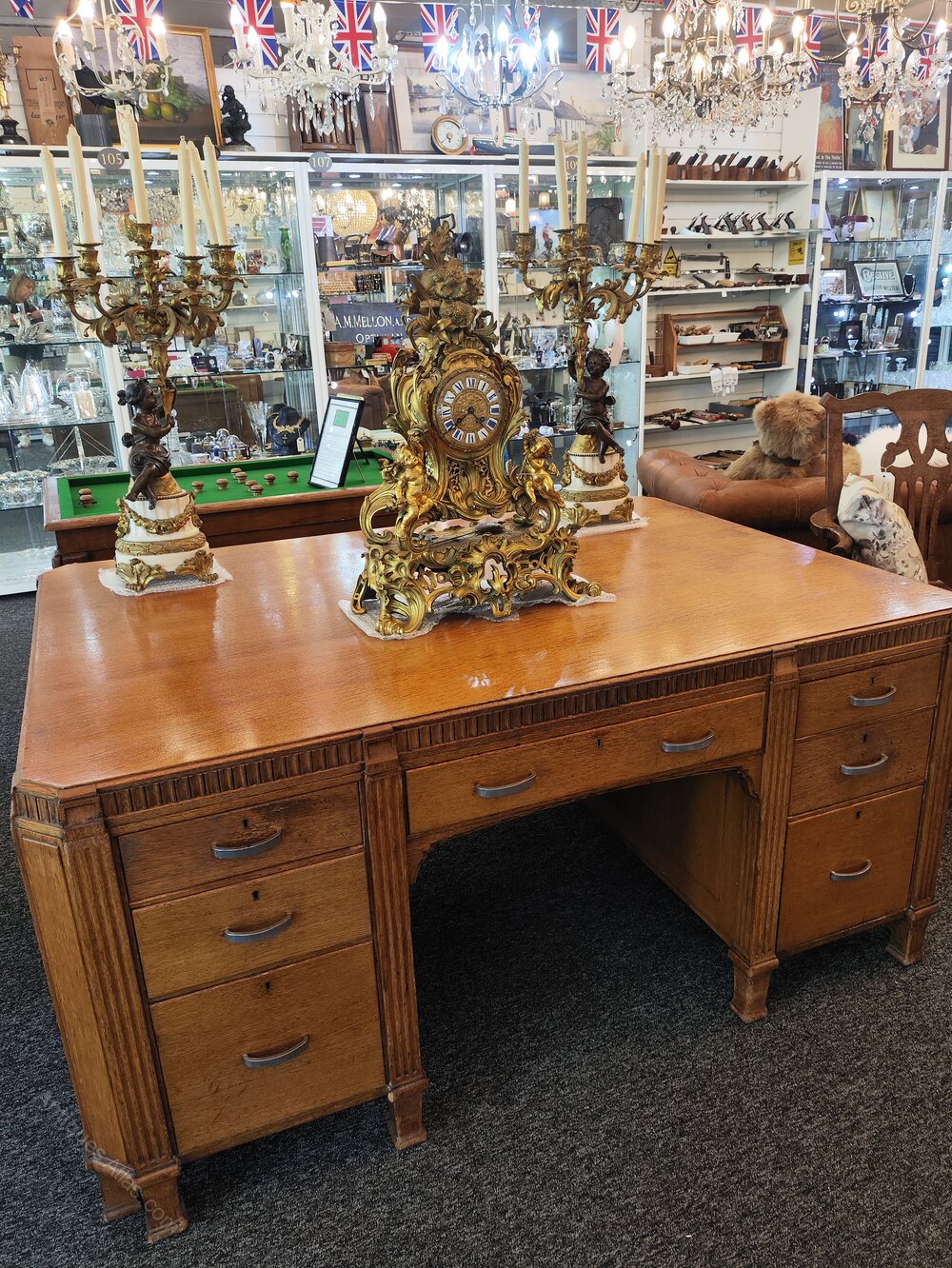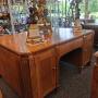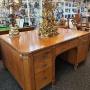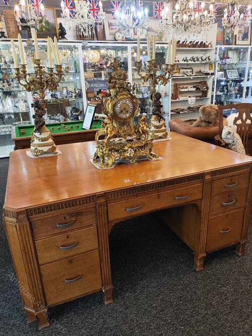 Light oak antique Art Deco partners desk. Seven drawers on one side and two cupboards on the other.