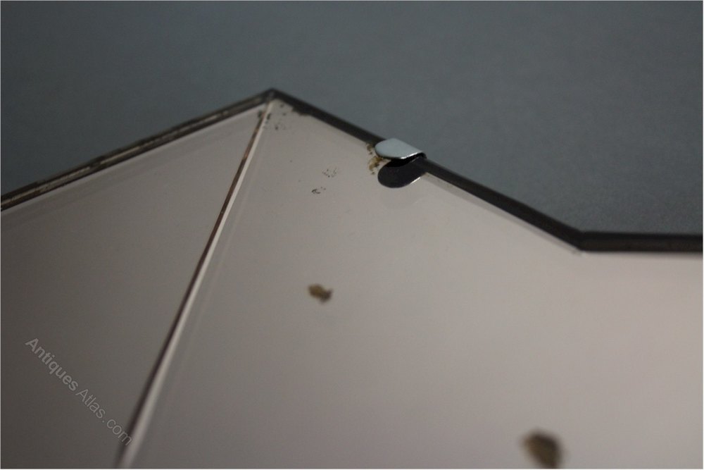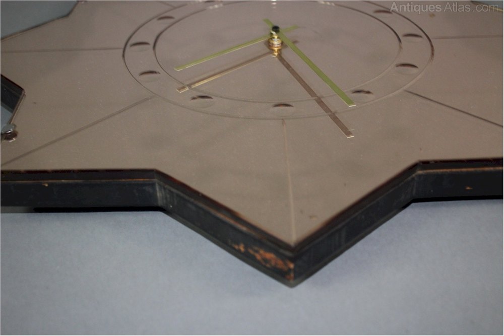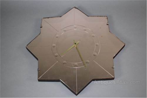Art Deco peach mirrored wall antique clock of star form. Wooden backed.