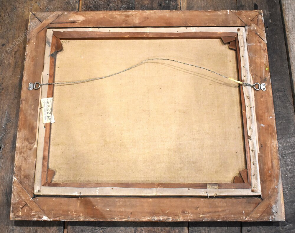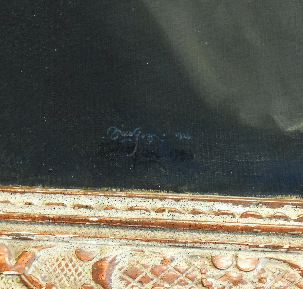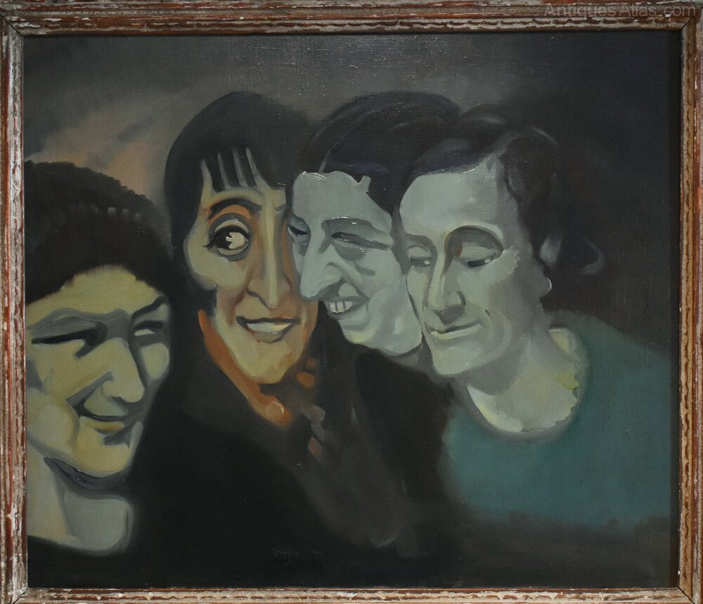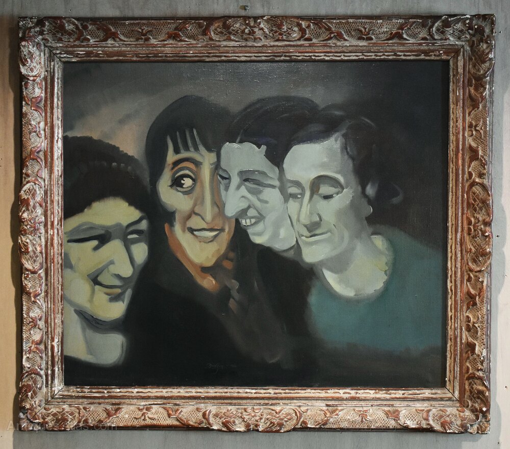A very interesting and decorative oil on canvas depicting a group of ladies chatting. The painting has a wonderful Art Deco period look with the ladies’ wearing fashions of the time and the group having a free and liberated feel. The work is very capably handled particularly in composition and perspective with the whole work having almost a surreal feel to it, with colours in shades of green. The painting is signed to the lower middle but is illegible, it is dated 1926. The work is in excellent untouched condition. The fine quality painted frame is the original and in good condition with a small area to one back corner repaired. The painting has a great decorative presence and is ready to hang.