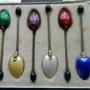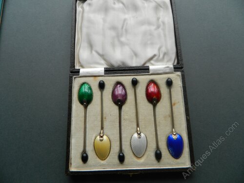 A beautiful set of Art-Deco silver enamelled spoons.. The spoons are hall marked for Birmingham 1934/35. The maker is Barker-Ellis Silver Co. The hook that holds the case shut is missing. One of the spoons has a small manufacturing fault. I only mention this for accuracy.The post cost is included in the asking price.