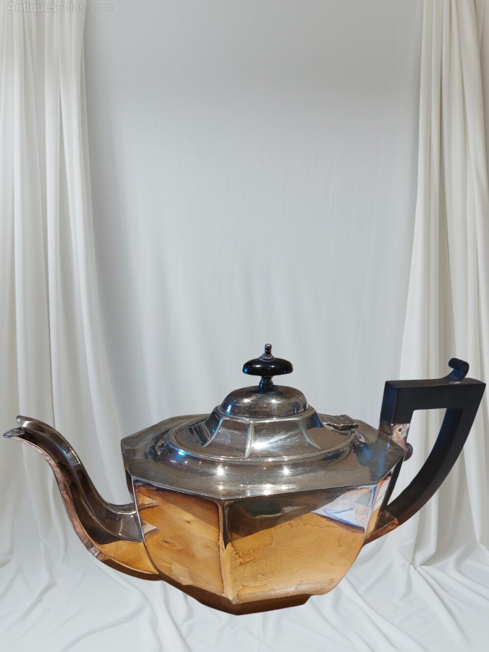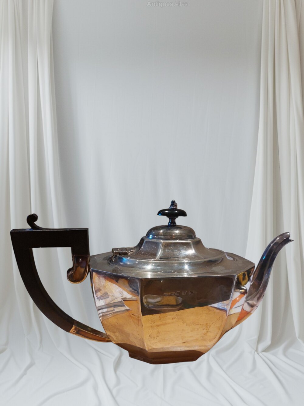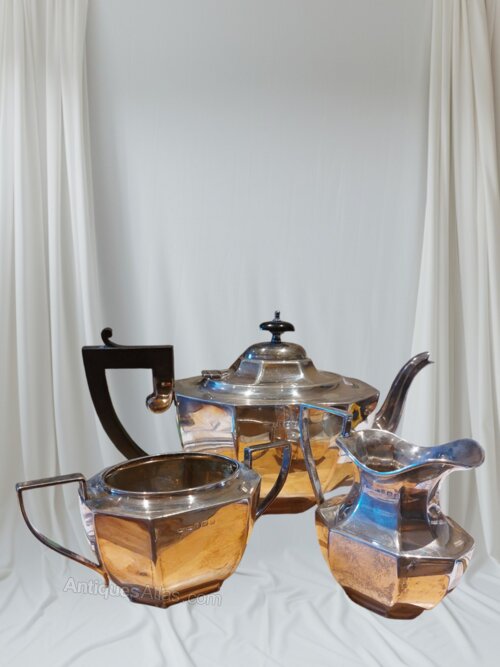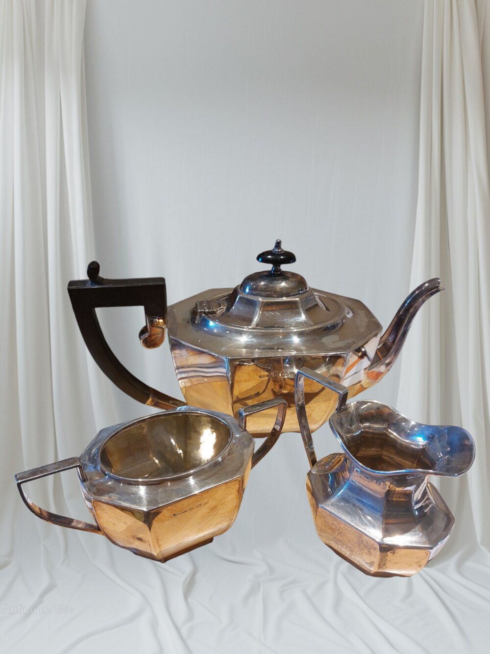 A very good Art Deco style and of the period silver 3 piece tea set. Birmingham 1931. All pieces fully hallmarked. Weighs approx. 1.1 kilos all in. Condition is very good with just 1 very small ding and 1 very small ping to the tea pot. (see pics). The teapot has a substantial 2 pint capacity and is water tight. Clear hallmarks.