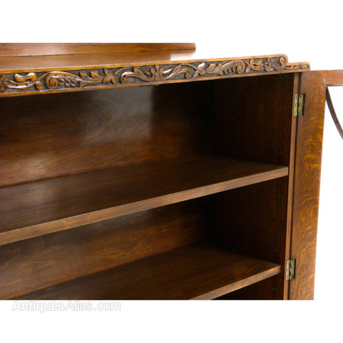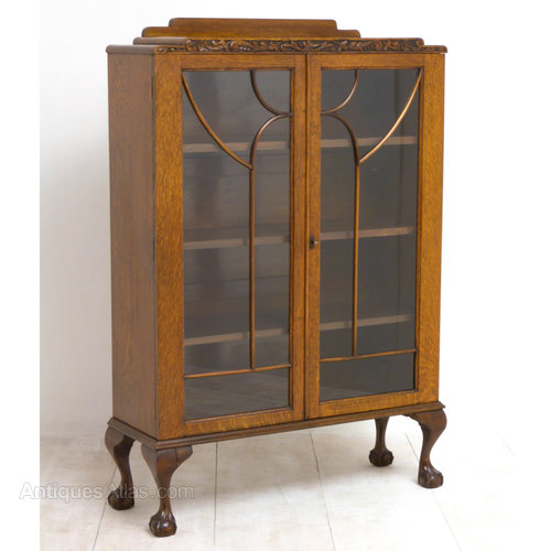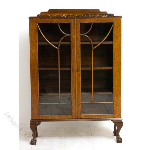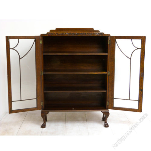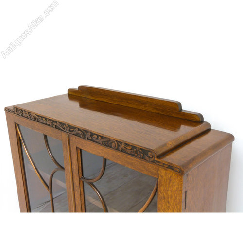 Predominantly Art Deco in style, this 1930's solid oak cabinet is very well made with a typical Art Deco shape. With a well carved frieze and stylized astragal glazed doors with three robust shelves within. The whole piece in very good untouched condition including the working lock and key. Cleaned and handwaxed in our workshop and is ready to enjoy.