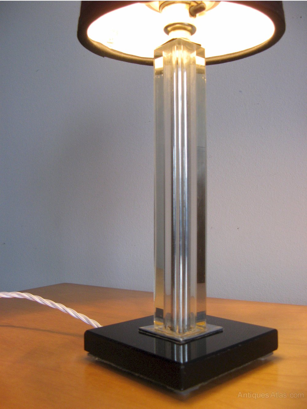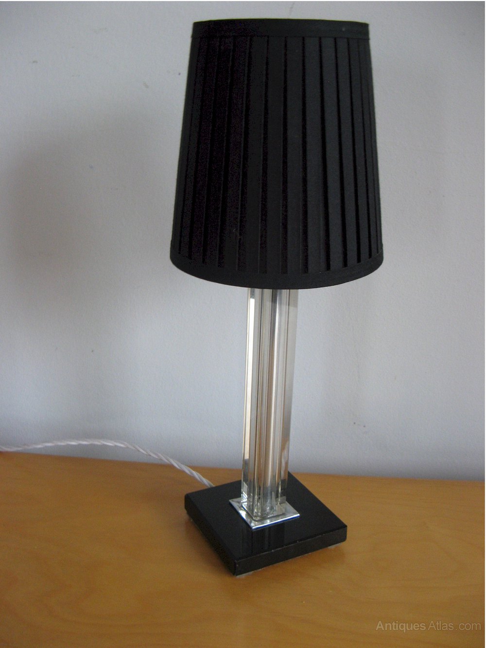 Art Deco table lamp .The clear glass stem on square black glass base with chrome switch and wired with woven white silk flex. Measures 11 in high x 4 in sq