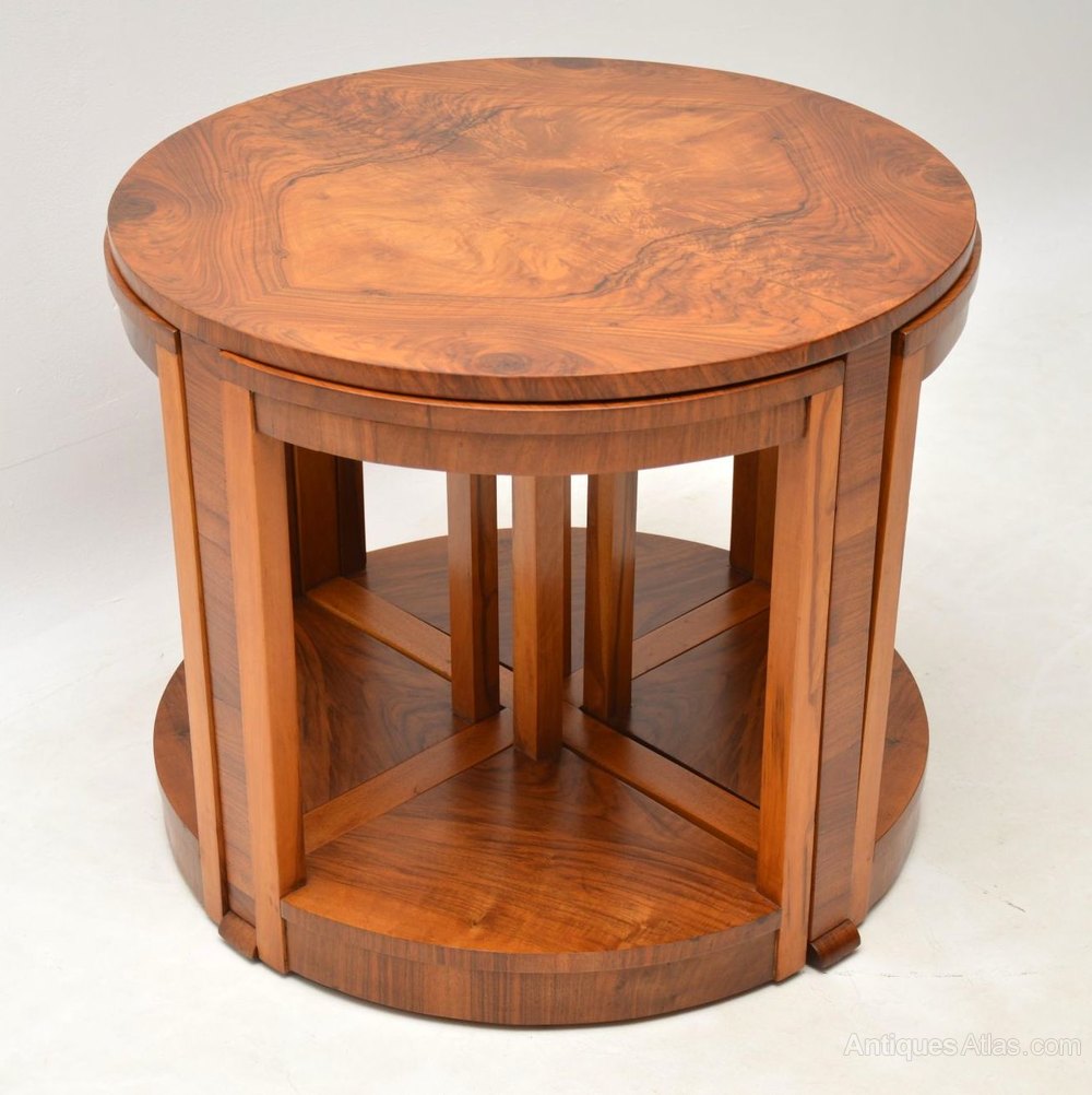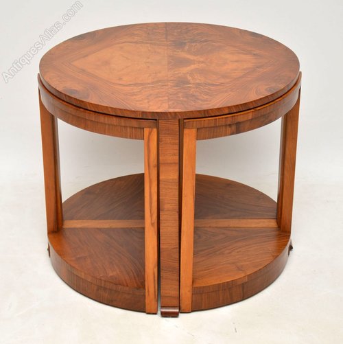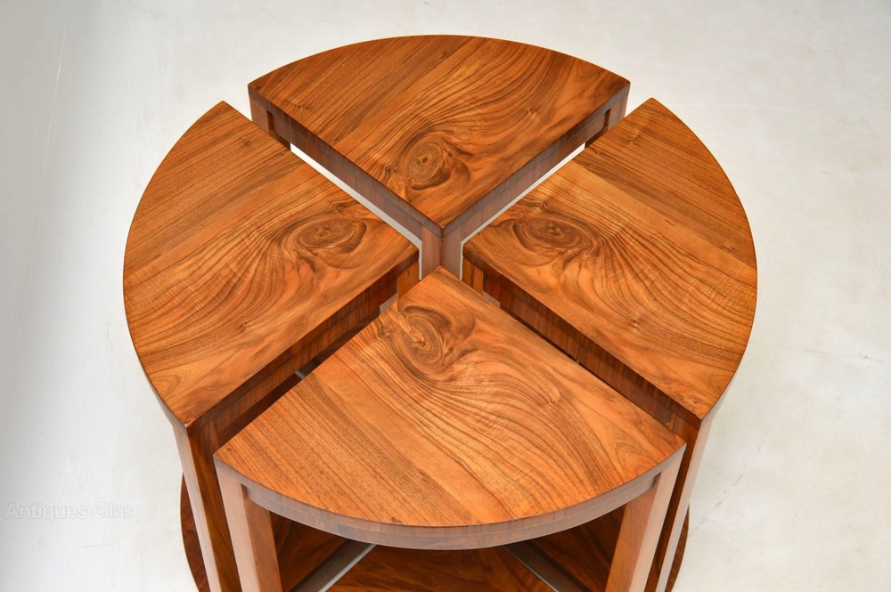 A beautifully made original Art Deco nesting coffee table, in stunning figured walnut. It dates from around the 1920-30’s period. This consists of a larger circular coffee table, with four pie shaped smaller antique tables that nest beneath the top. We have had this stripped and re-polished to a very high standard, the condition is excellent throughout.