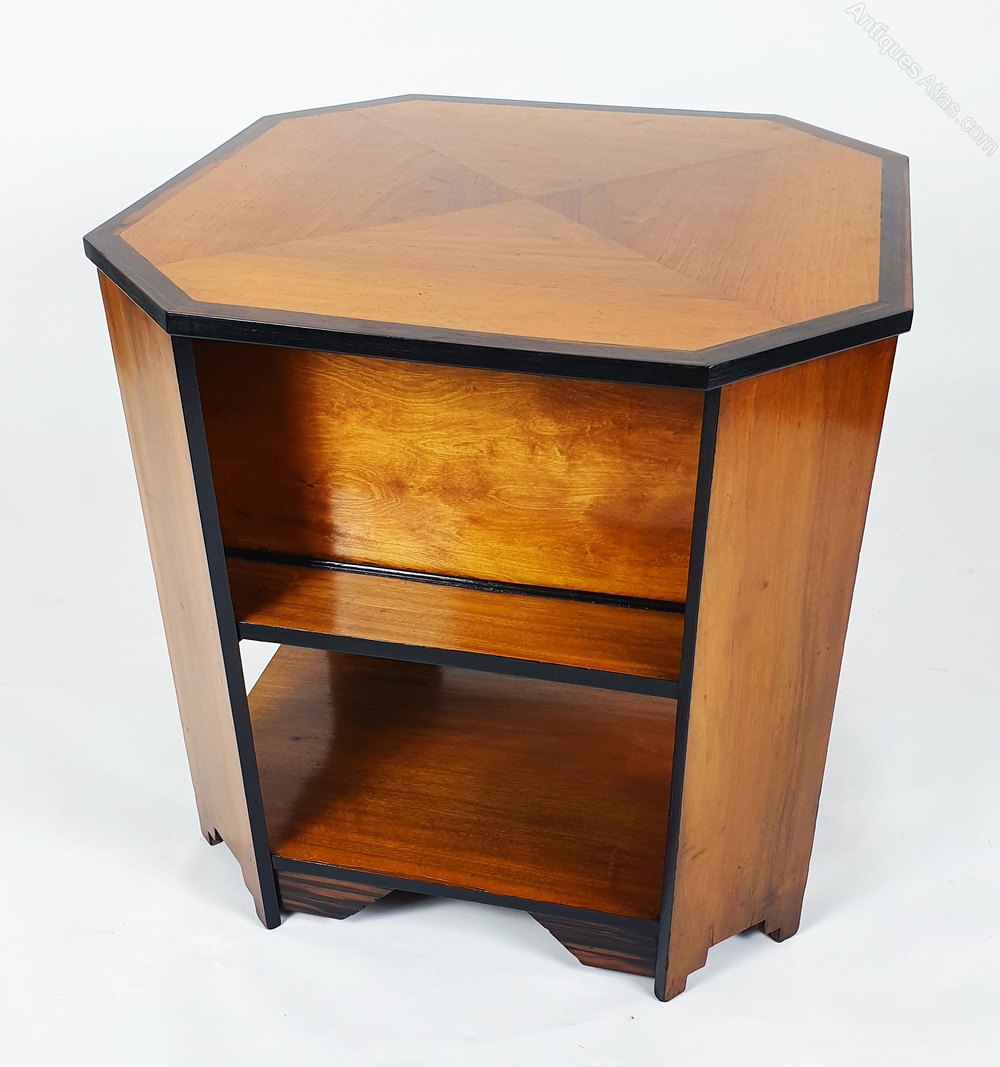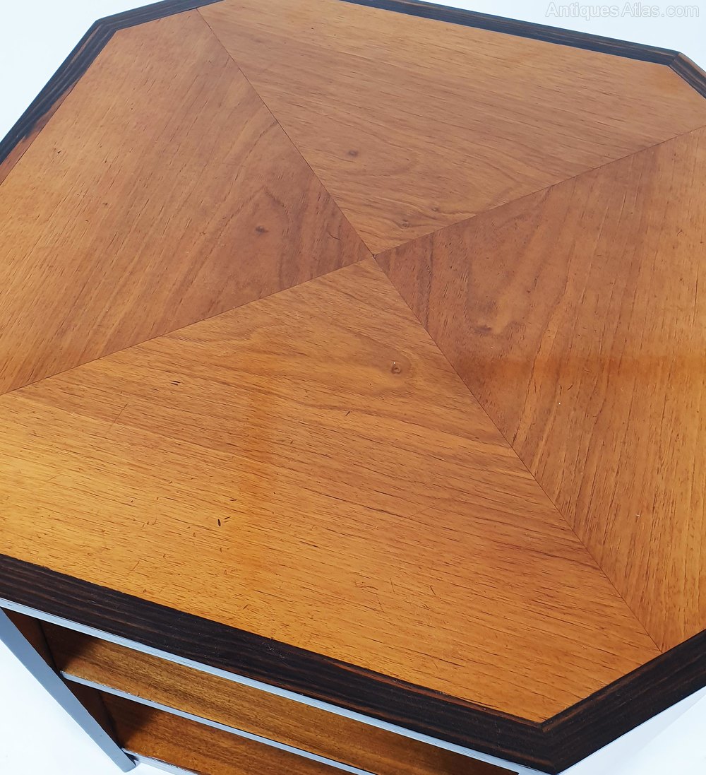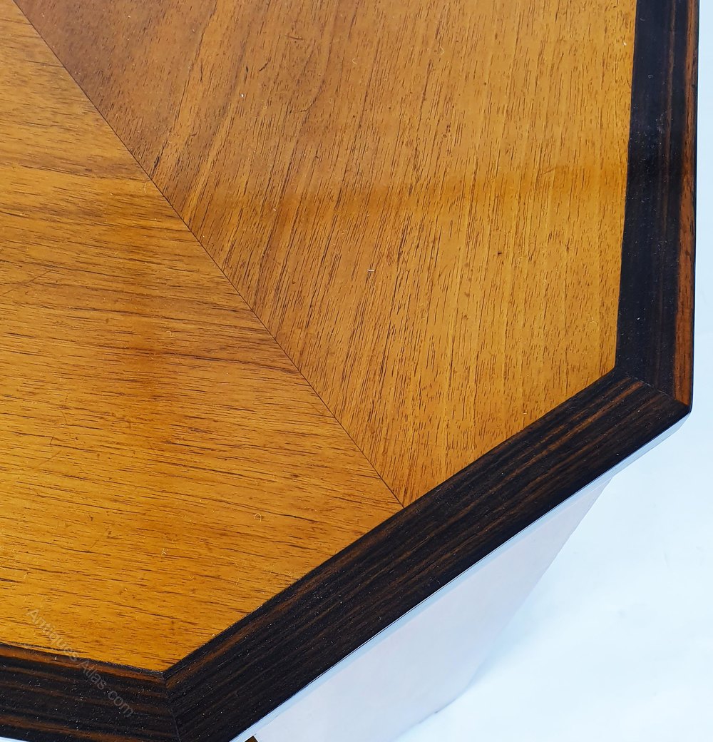 This attractive and well-proportioned Art Deco walnut center table with coromandel trim is octagonal in shape with shaped supports and a central shelf. The table measures 27 3/4 in - 75 cm in both diameter and height and a beautiful rich patina. This piece would make an excellent accent to many different rooms and decors.