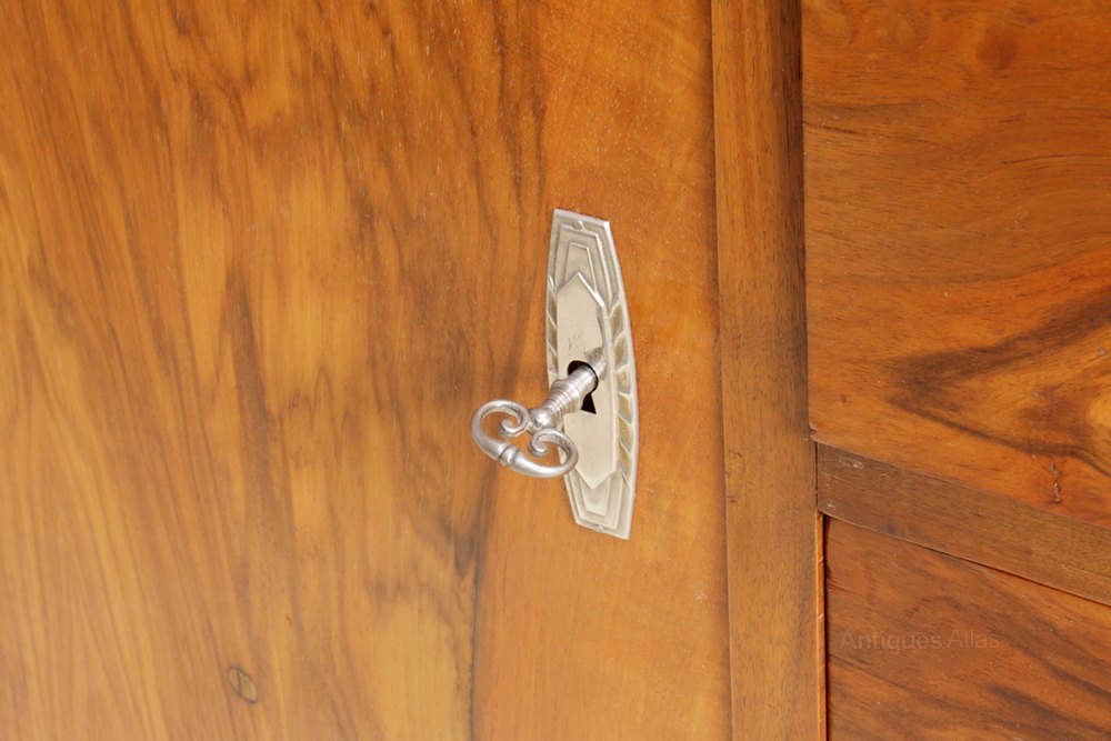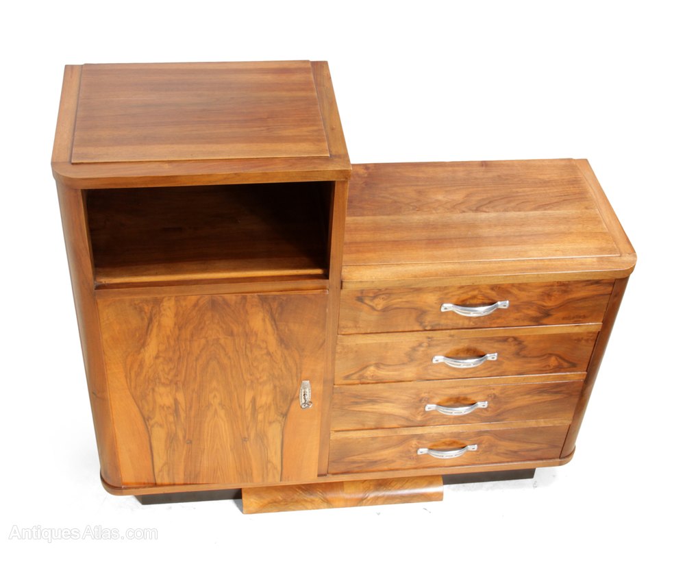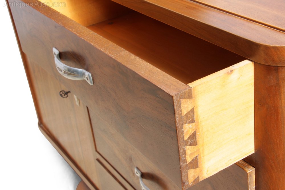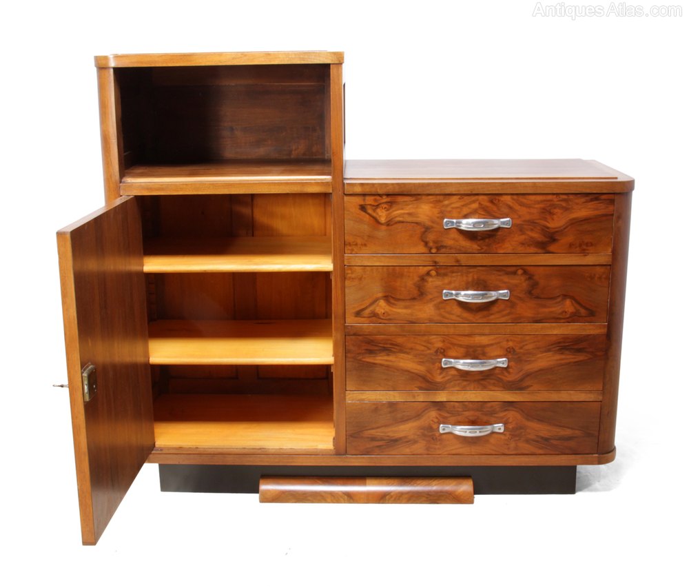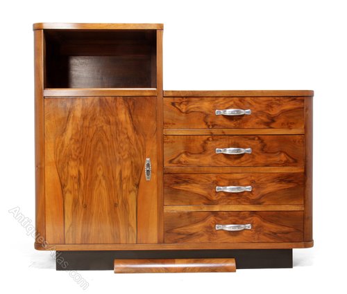 This Art Deco chest has four drawers and a cupboard with adjustable shelves behind, produced in France in the 1930's with dovetail joint construction. This walnut cabinet has been professionally restored and hand polished