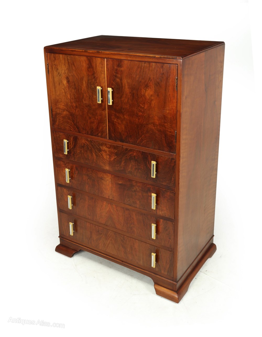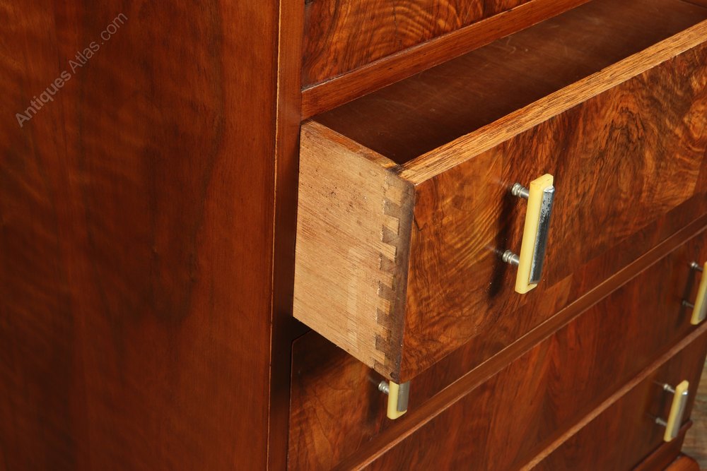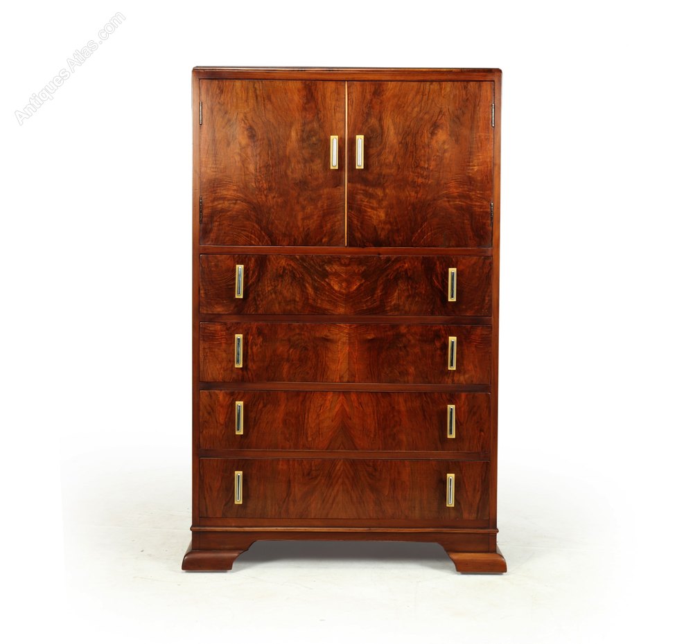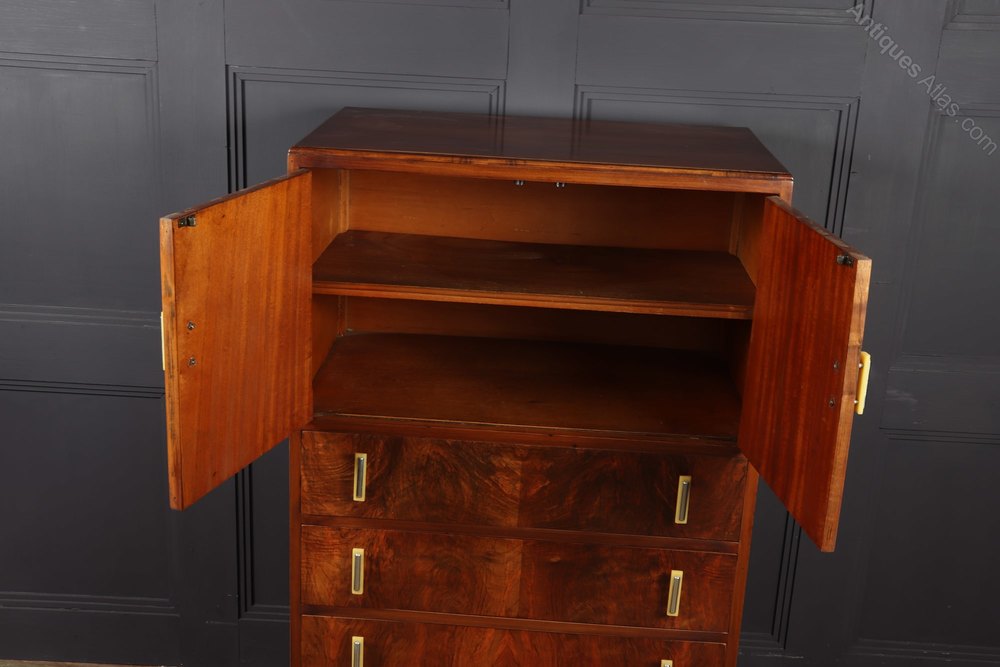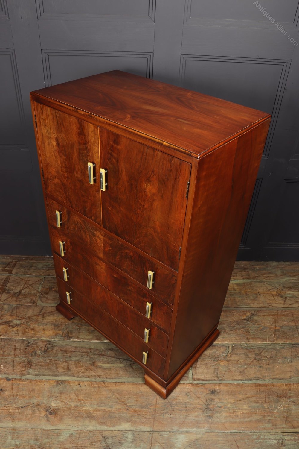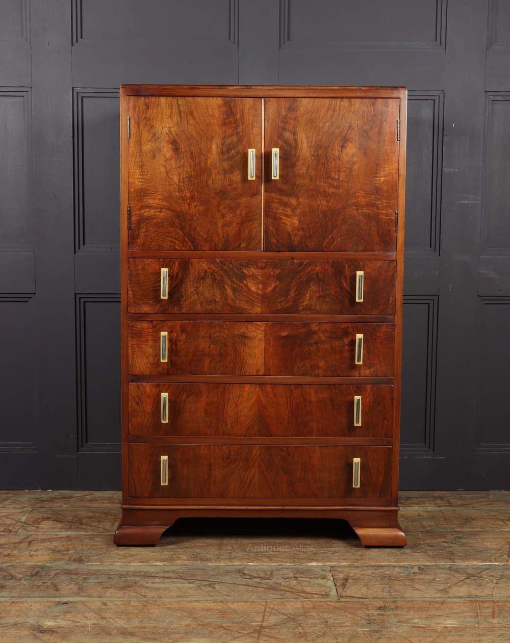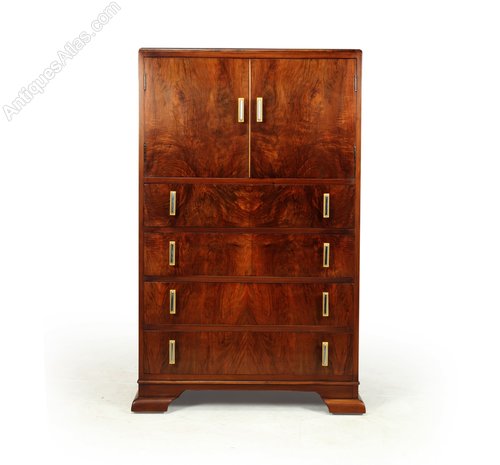 An English produced art deco walnut tallboy having four drawers with cupboards above. The cabinet has chrome and phenolic handles. The drawers all run smoothly and doors work as they should. The cabinet has been fully polished and is in excellent condition throughout