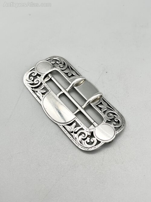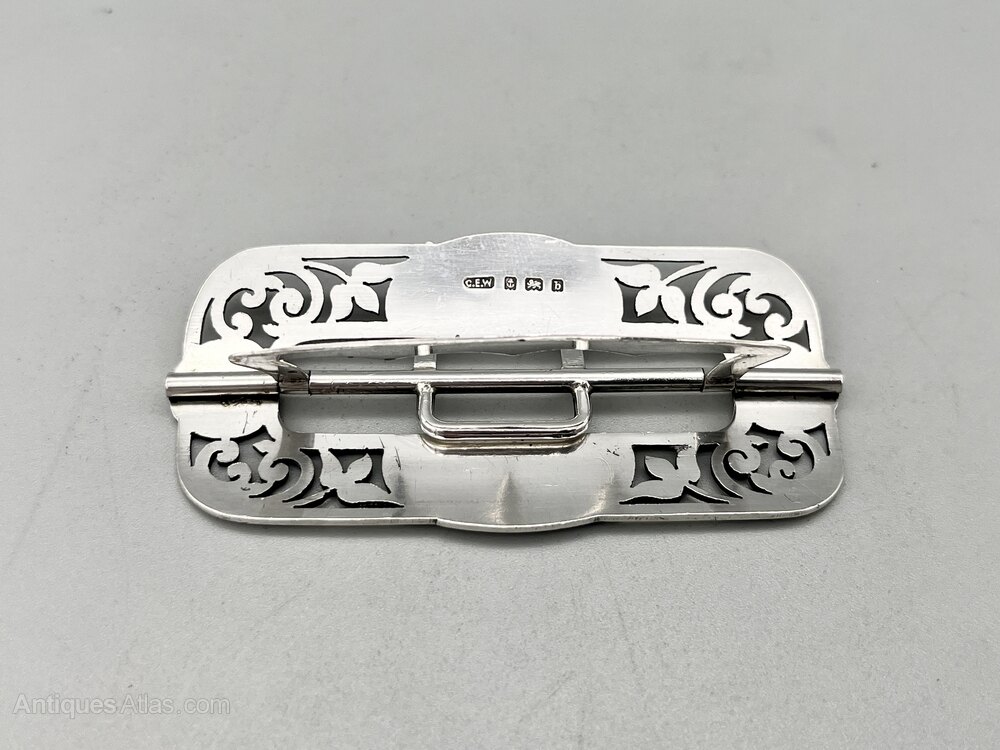 The buckle was made in Birmingham by G.E. Walton & Co and dates to 1901. George Edwin Walton founded his company in the early 1880s with manufacturing in Birmingham and a showroom in London's prestigious Hatton Garden. They produced a very wide range of items including tableware and flatware, desk accessories, dressing table items and smoking accessories. The firm ceased trading in 1913.