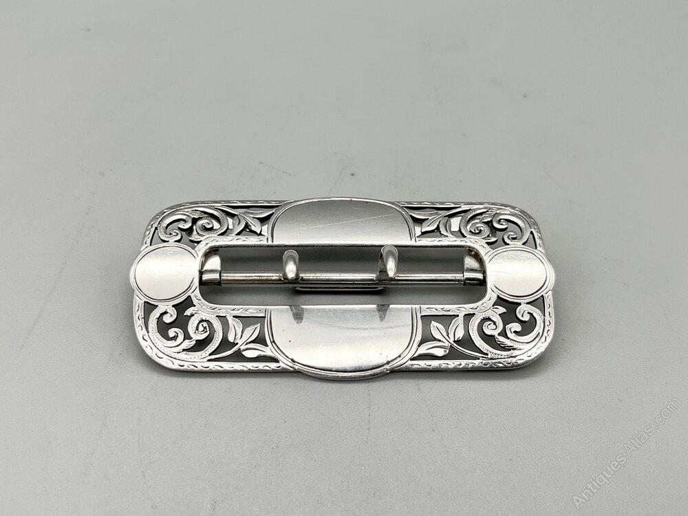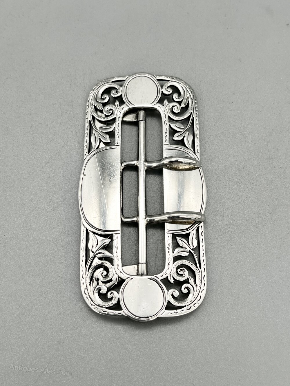 Here we have an elegant Art Nouveau Sterling Silver Belt Buckle from the Edwardian era. The two pronged buckle is oblong with a pierced flowing design of flowers and foliage and rounded corners.