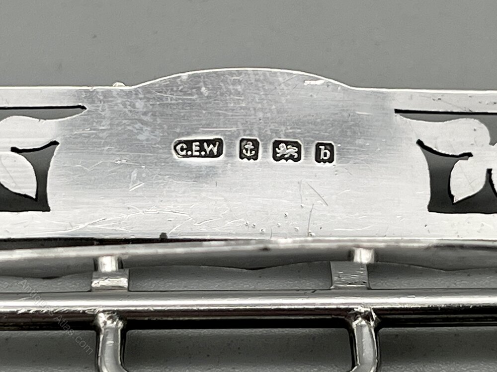 The hallmarks, on the back of the buckle are well struck and clear to read. They show the lion passant for Sterling Silver, the anchor assay mark for Birmingham, the date letter b for 1901 and the G.E.W makers' mark for G.E. Walton & Co.