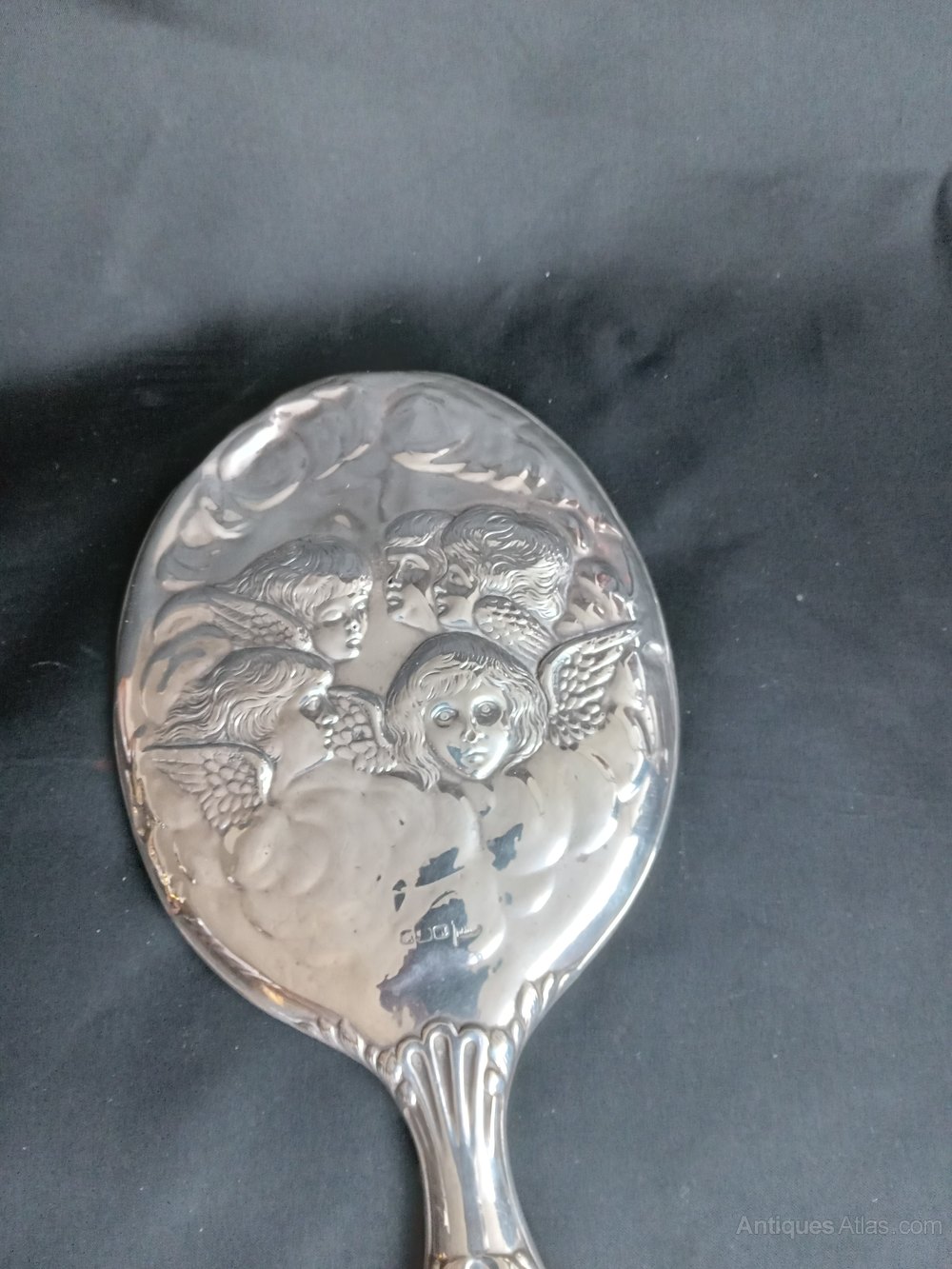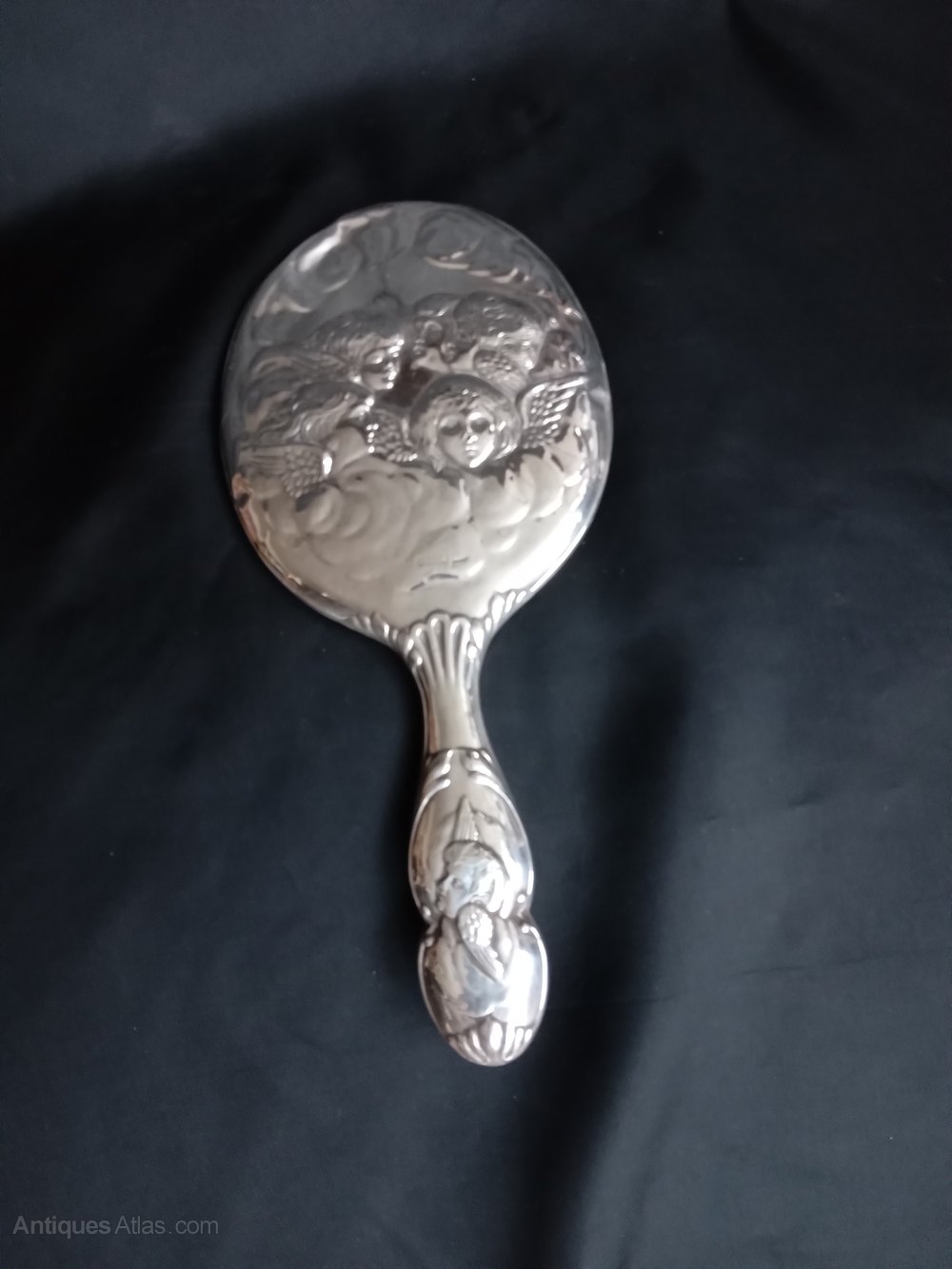 Here is a Lovely ART NOUVEAU Ladies Dressing Table Mirror in Silver. Hallmarked: Sheffield 1904. The Mirror has slight inclusions but nothing really serious. The Whole Back is in relief with Cherubs. A good item and reasonable priced.