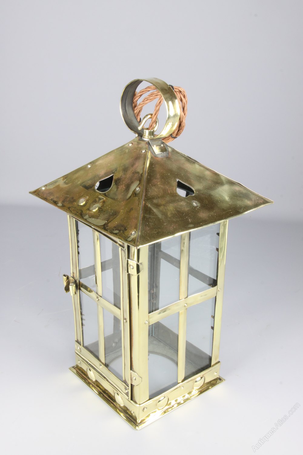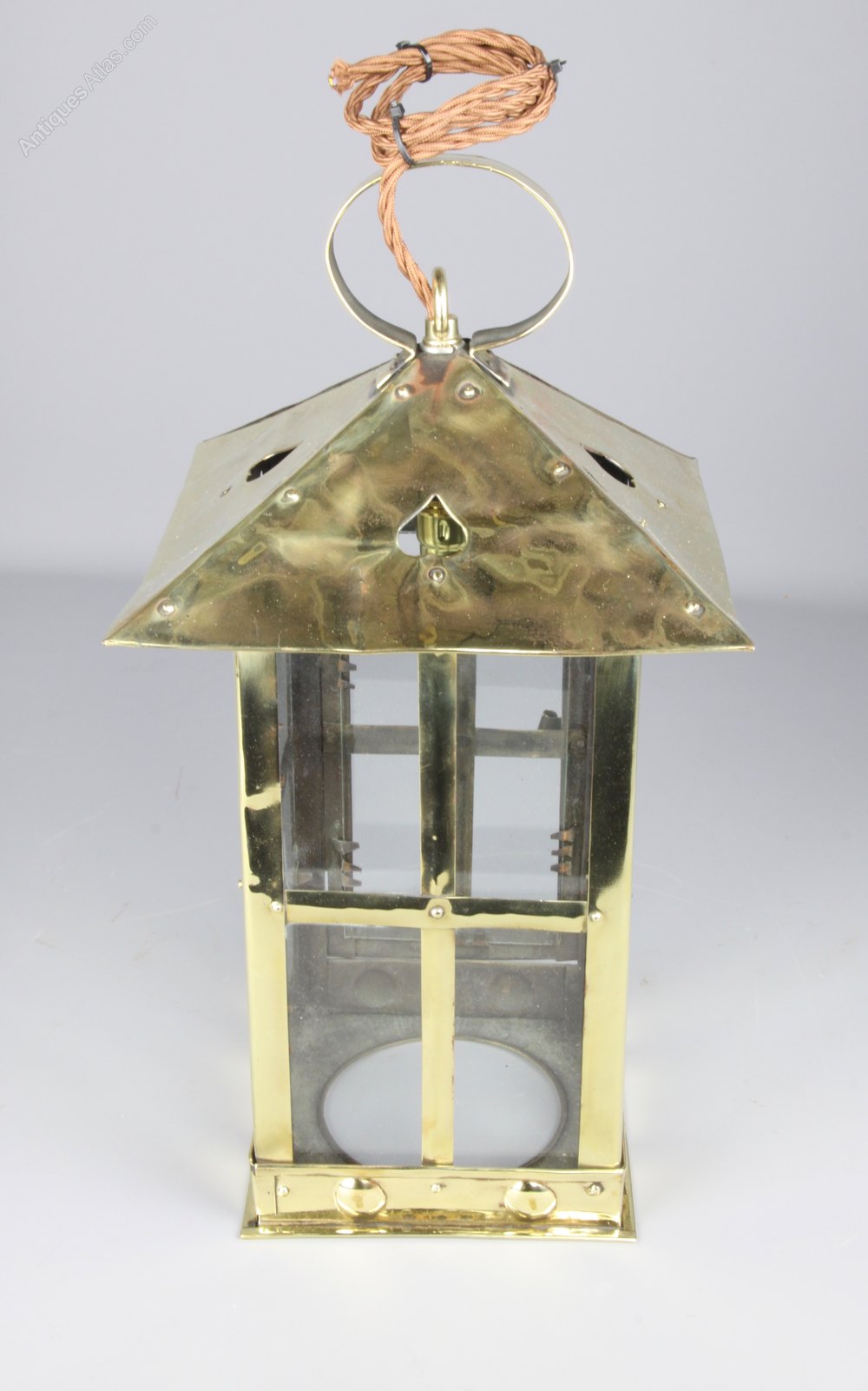 A lovely tall Arts & Crafts brass ceiling lantern, dating to circa 1910, with a side door with latch fastening and four pierced hearts to the top. Offered in good condition, commensurate with age, it has been re-polished and rewired, with new fittings. It measures 43cm max high including the loop handle, and 22.5cm max square at the top. The price includes UK postage.
