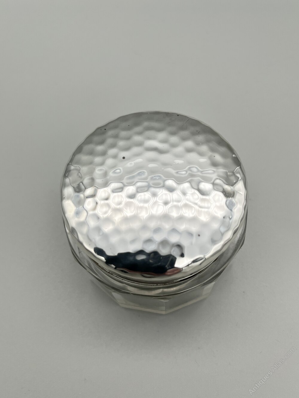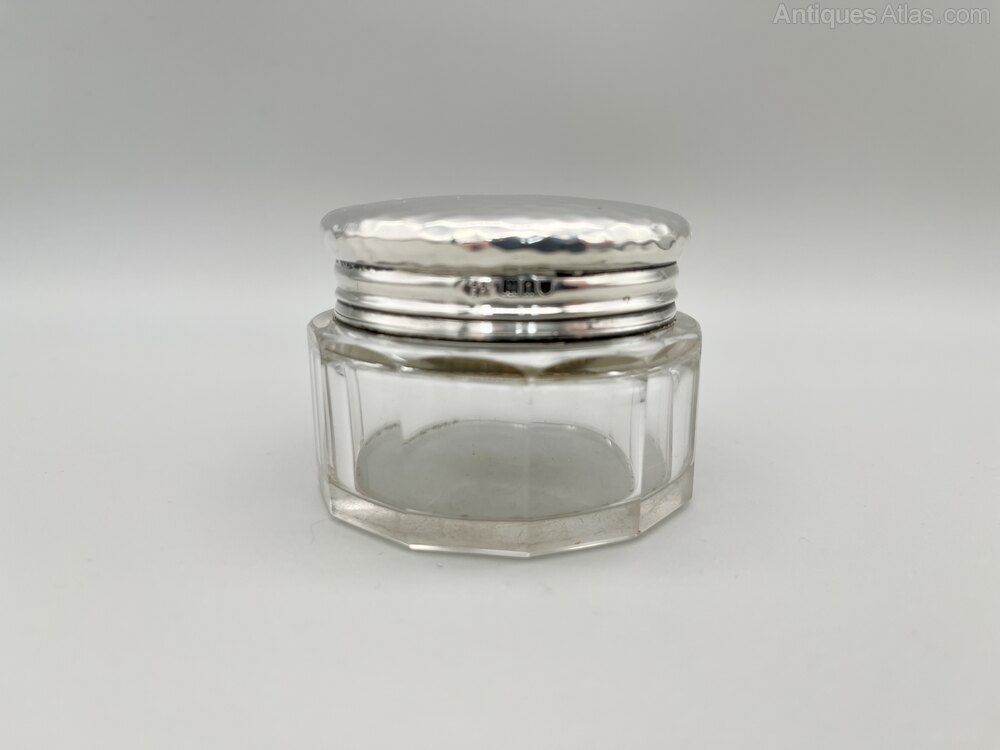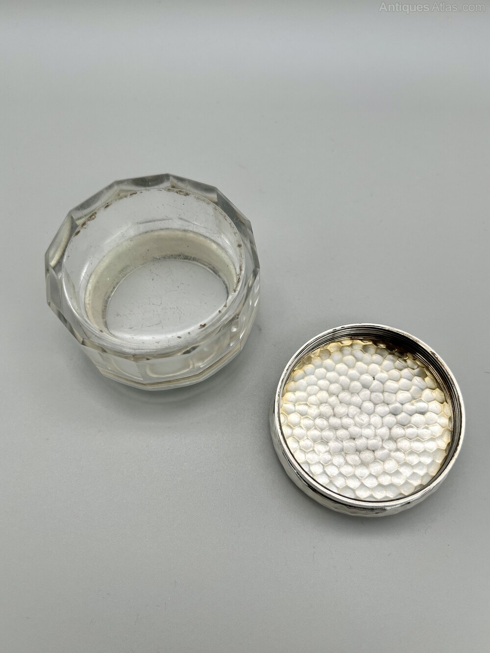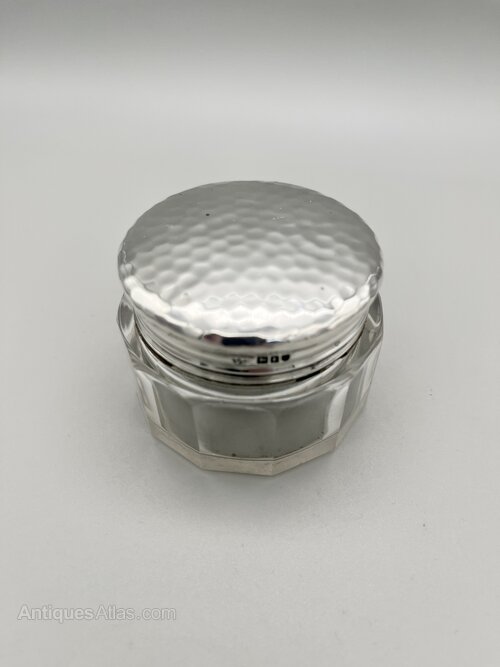 This is an elegant Arts & Crafts Cut Glass Dressing Table Pot with a Sterling Silver Lid. The circular pot is slice cut all around the body and has a flat base. The silver screw top lid has planished decoration across the top and is lighlty gilded on the inside. There is a silver threaded collar at the top of the glass pot.
