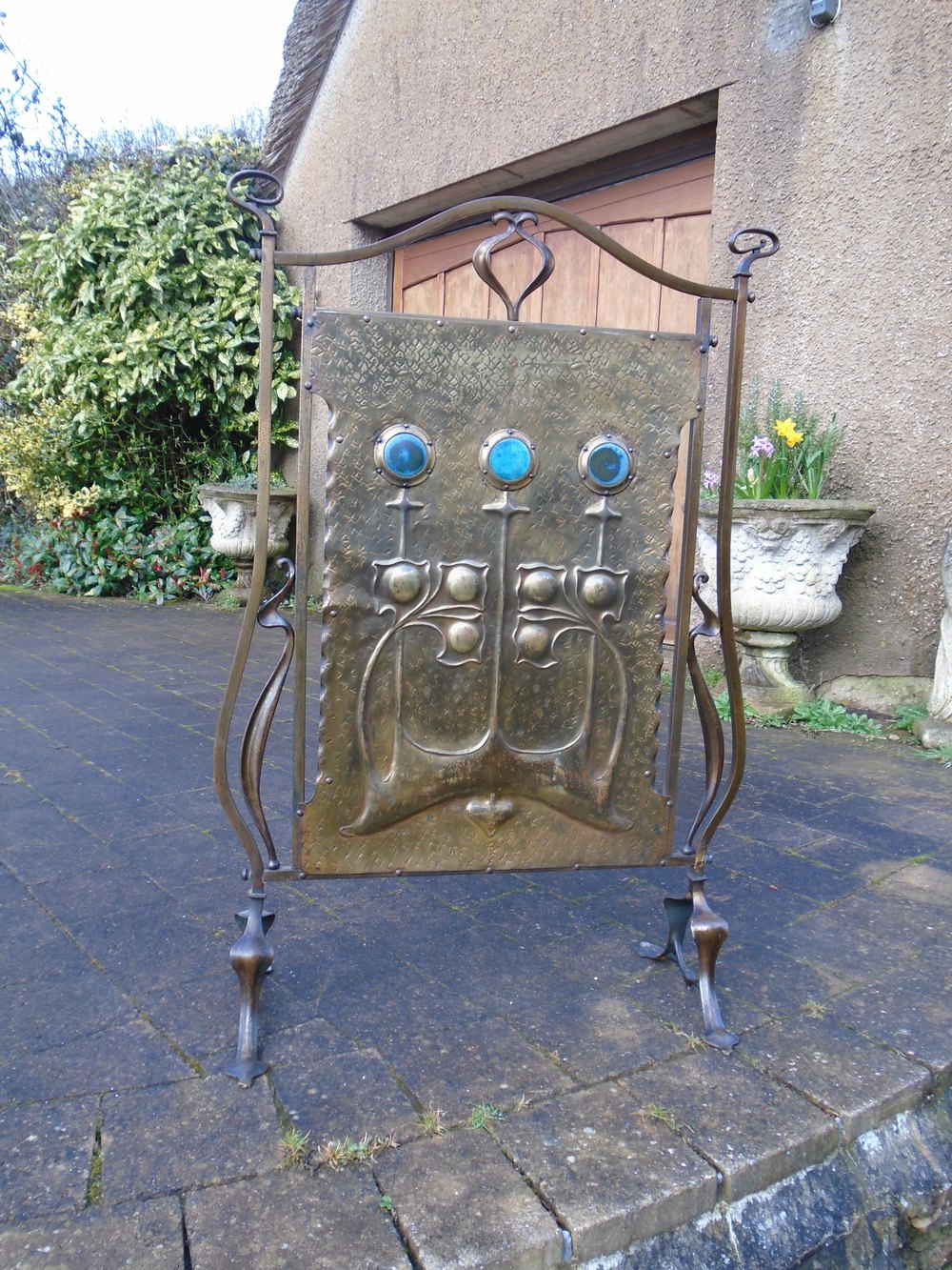 The fire screen has three stylised flower heads each with a cabochon above leaves. This is 92cms high, 61cms high and 28cms deep at the feet.
