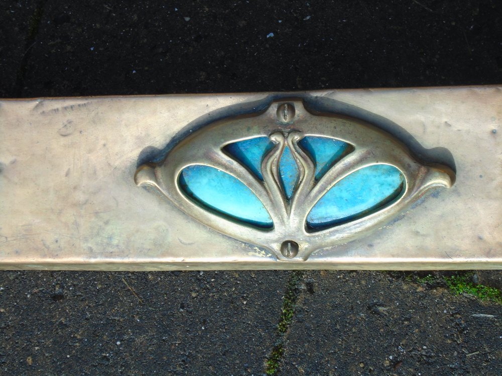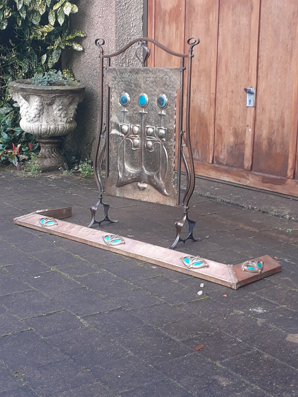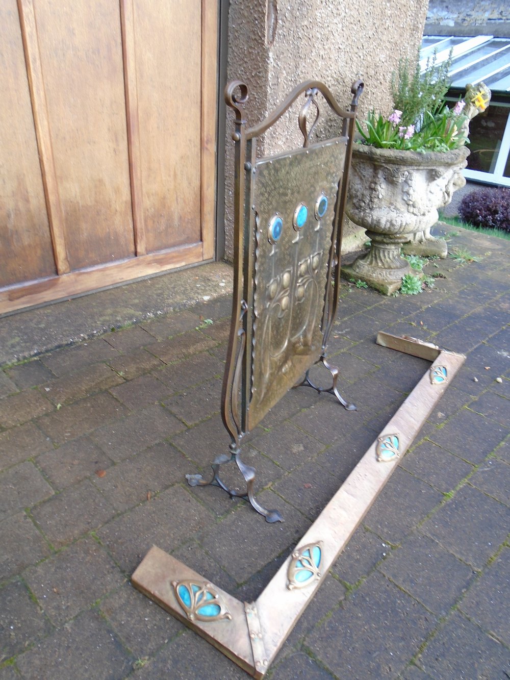 Stunning Arts & Crafts brass fire screen and complimenting fender both with beautiful cabochons. The fender has three large ones inset to the front with one at each side.