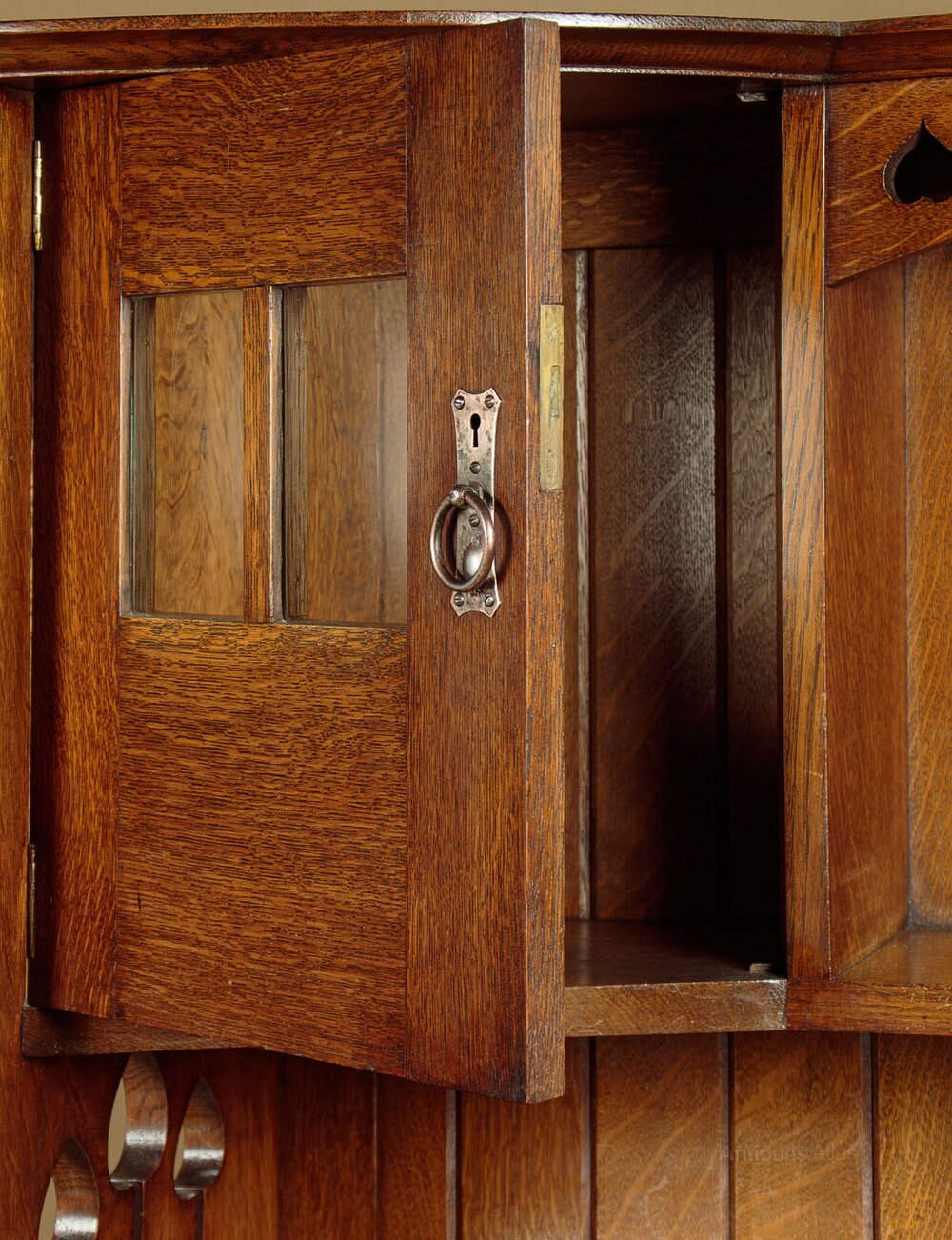 Superb Arts & Crafts oak dresser c.1900. Maker unknown but very much in the manner of Liberty & Co. Top featuring a slim moulded cornice over small glazed cupboard doors either side of an open shelf with an arched apron pierced with heart-shaped cutaways. Note also the lovely spade or flower head shaped cutaways to the sides. Base with and overhanging top, two drawers and a single cupboard (internal depth 18") over an open potboard shelf, also featuring an arched apron above with pierced detail, and unusual shaped apron below. Retaining the original copper plated handles and domed glass panels. Solid oak sides, drawer linings and backboards. Excellent colour and condition, cleaned and waxed in our workshops. Key supplied.