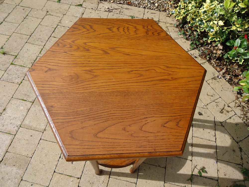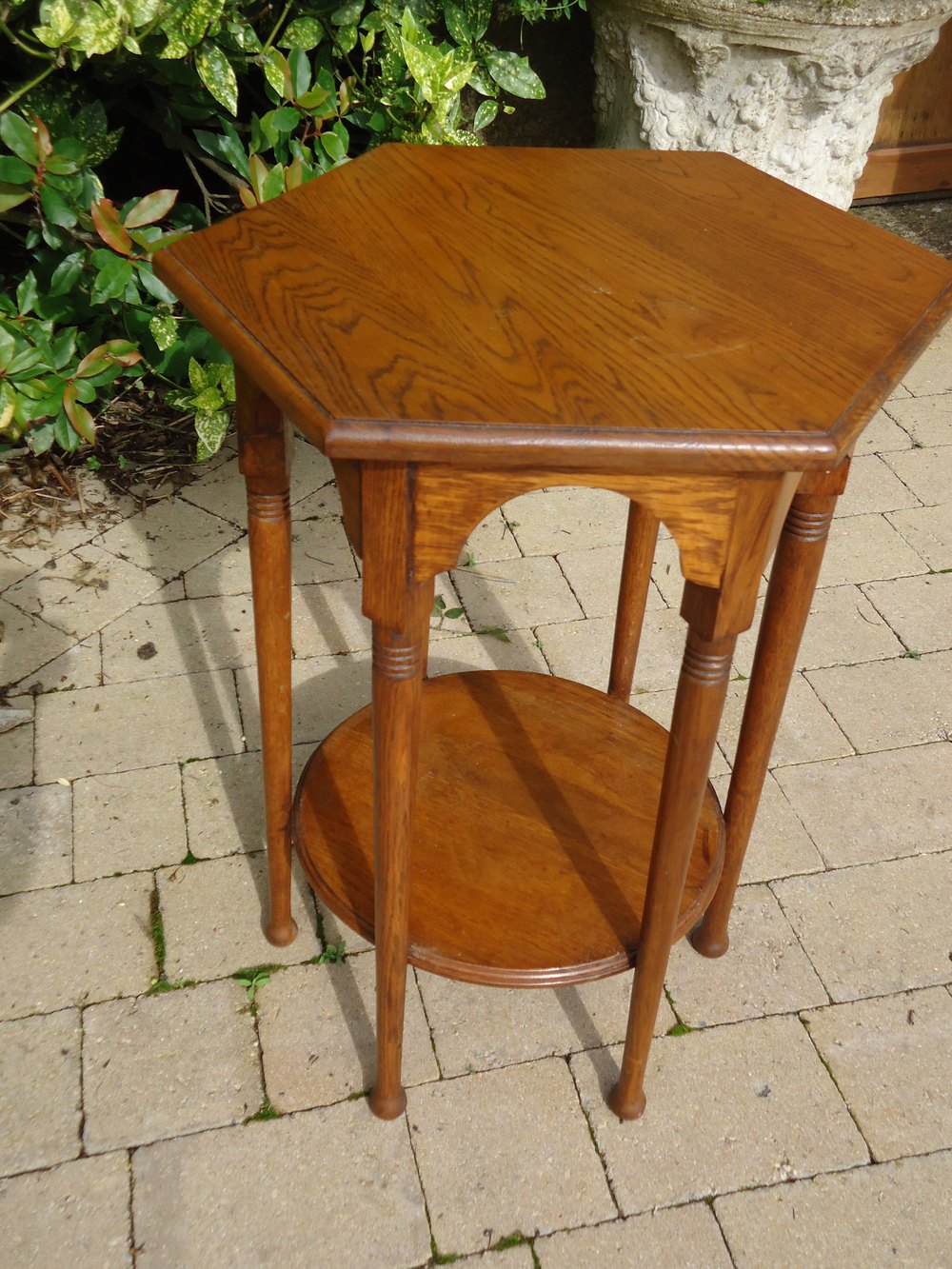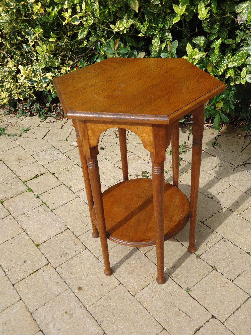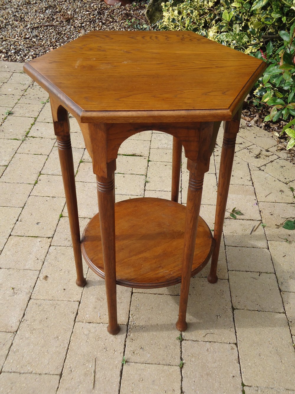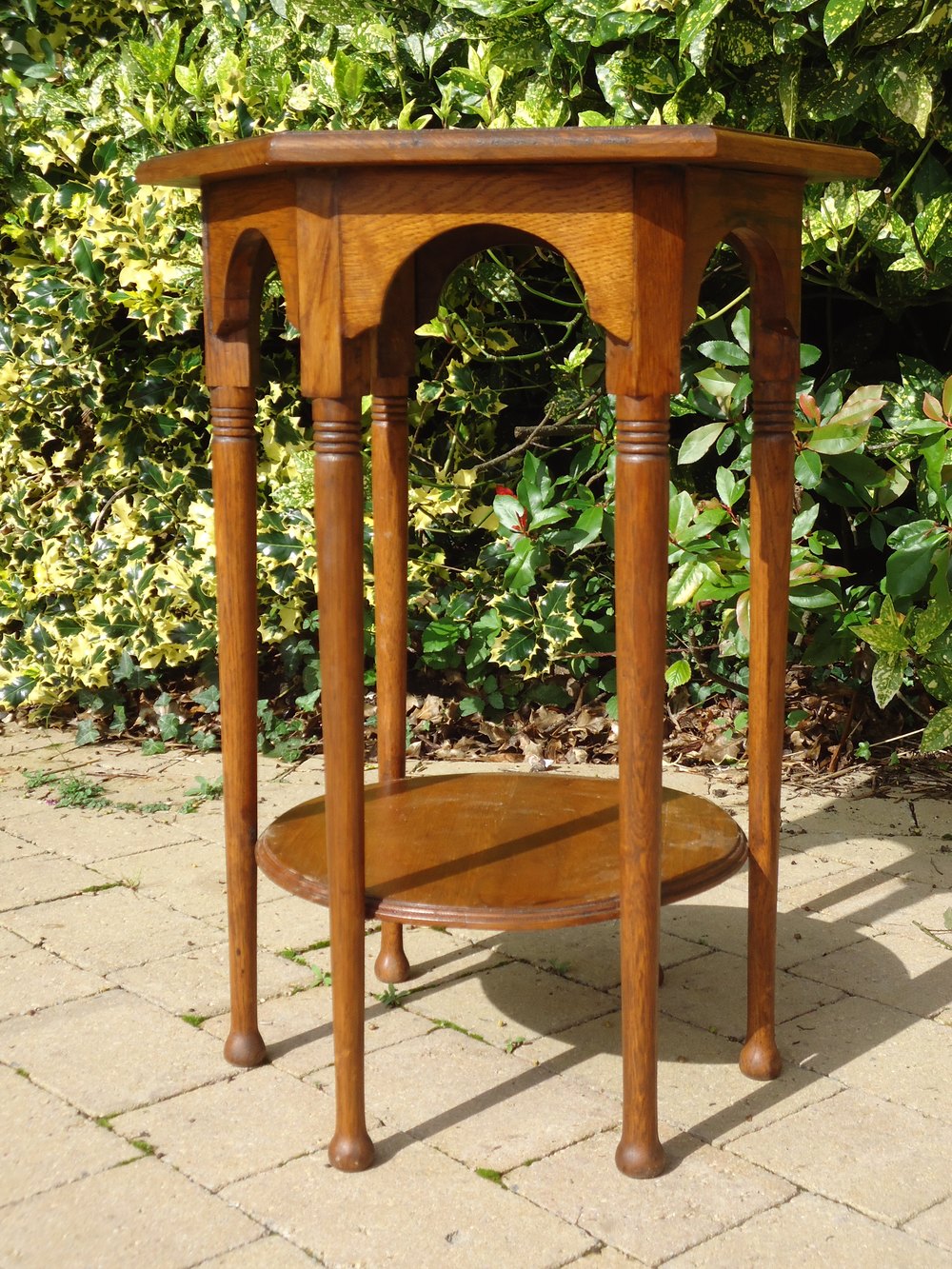 Large Arts & Crafts oak lamp table in the Moorish style with arches and with ring turnings to legs. A design favoured by Liberty & Co.