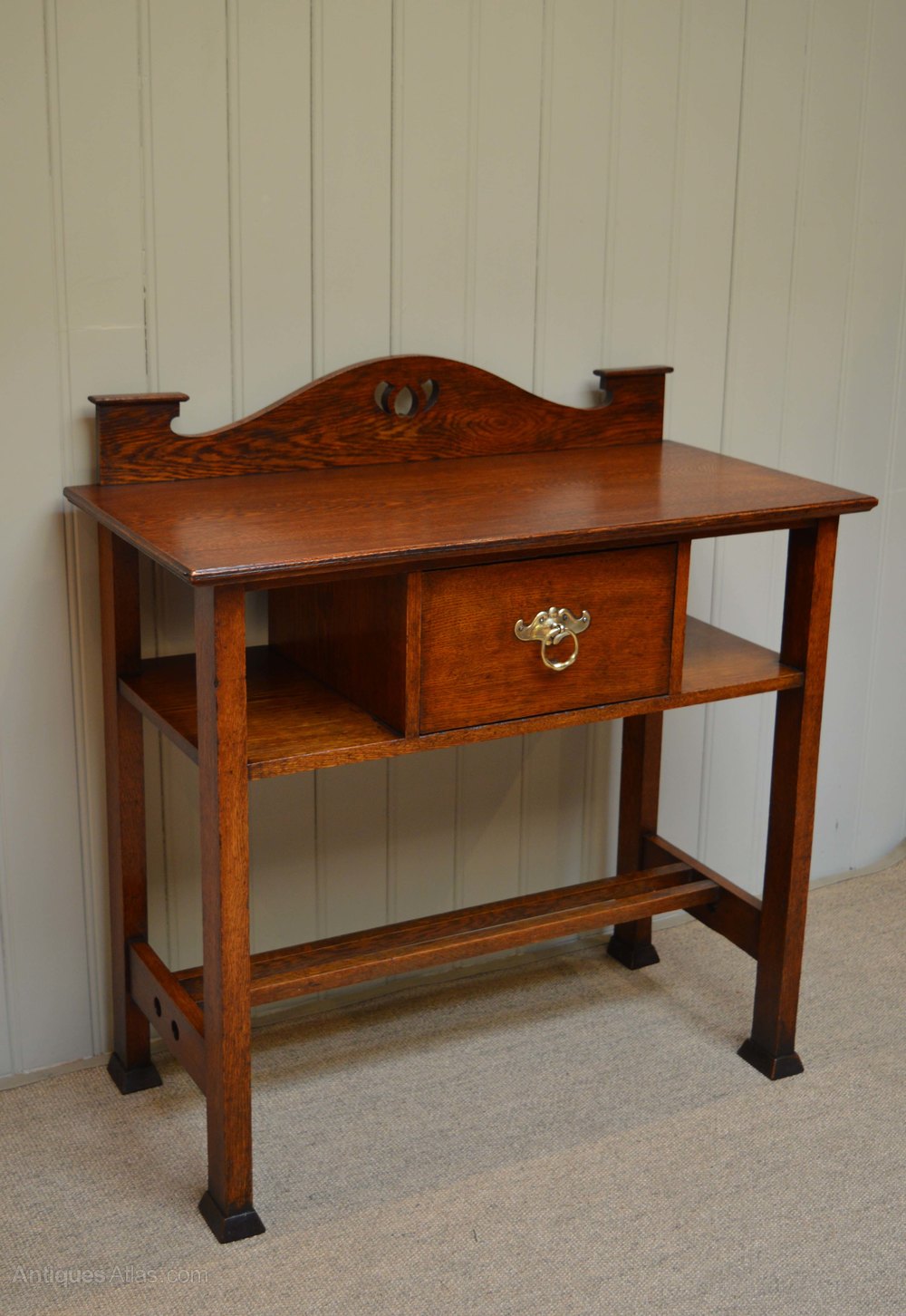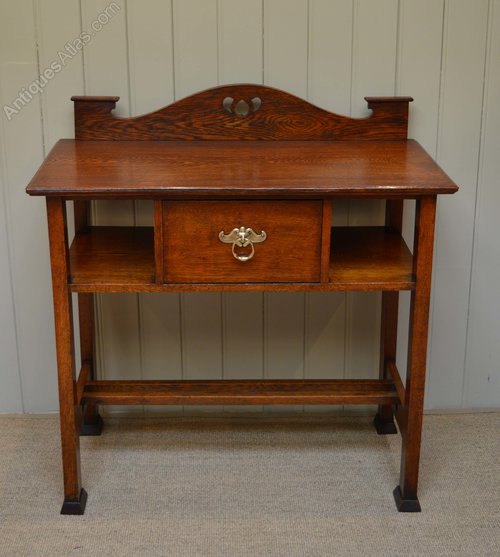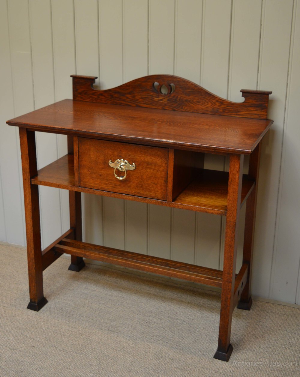 Arts and Crafts oak hall/ side table having an upstand with pierced decoration above a single drawer flanked by shelves. Raised on straight tapering legs with spade feet united by a double under stretcher