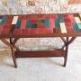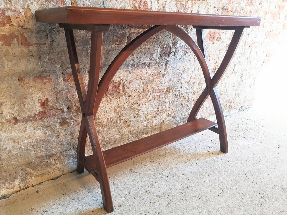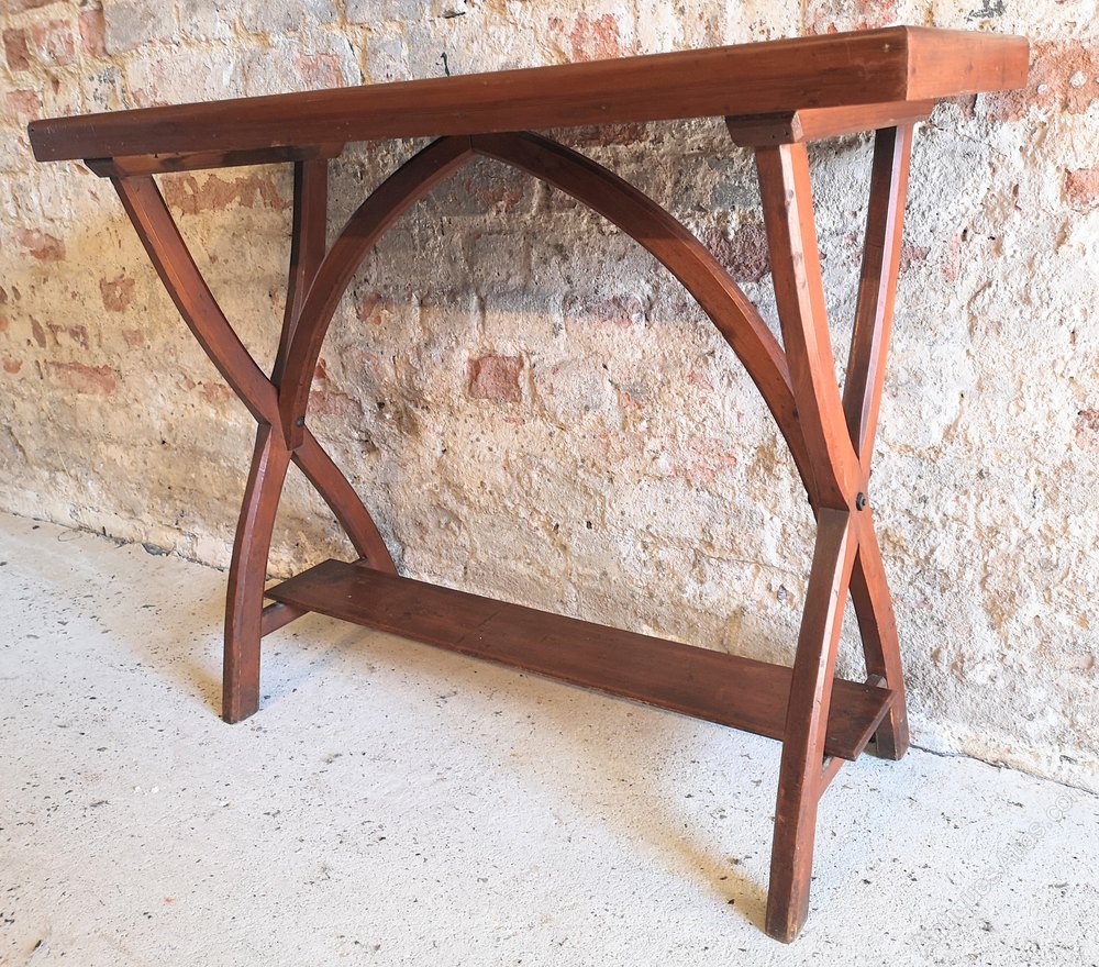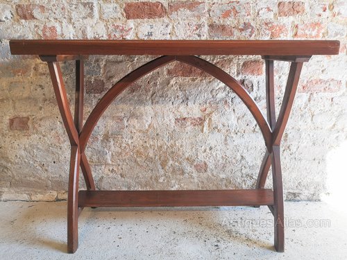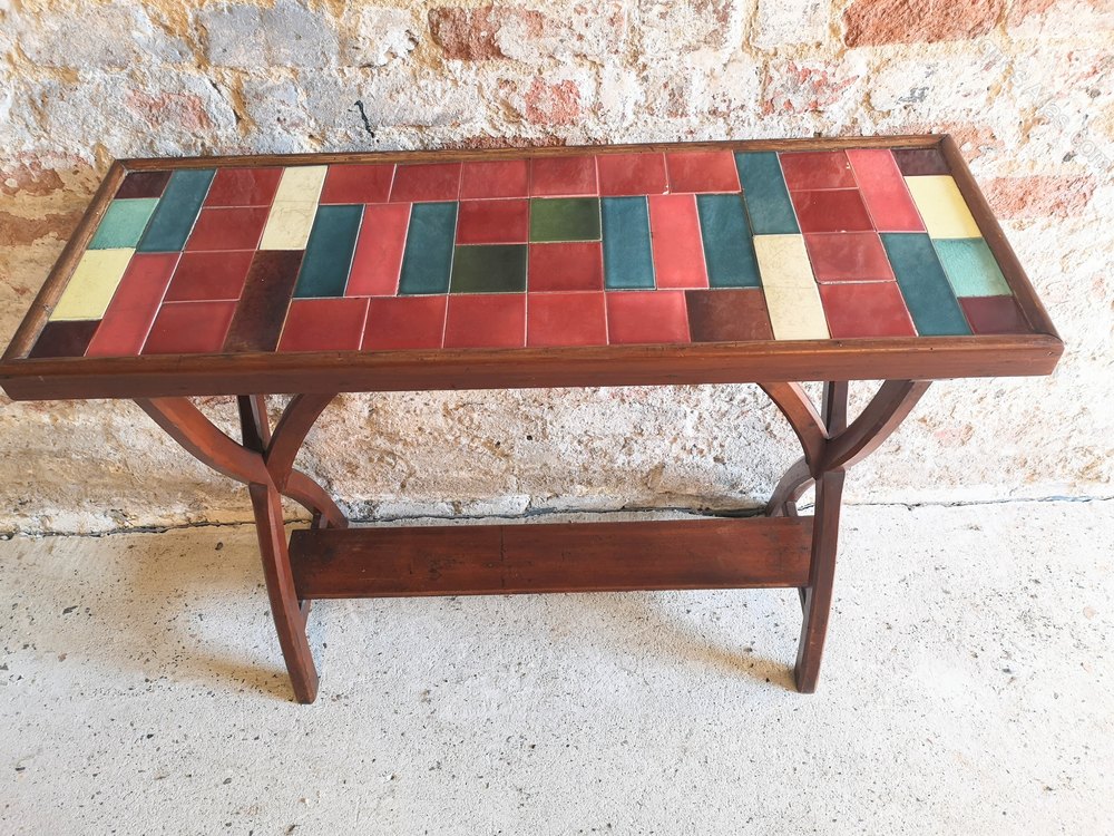 A Gothic style pine Arts and Crafts Tiled top table in used worn condition measuring 97 cm x 35 x 76.