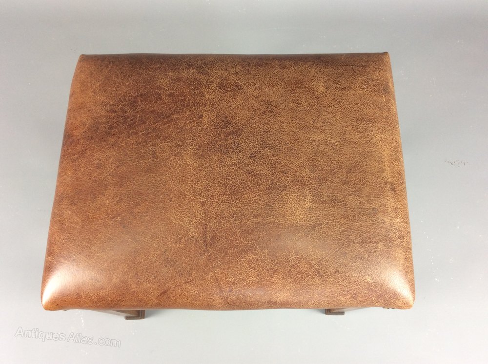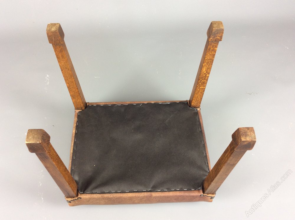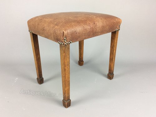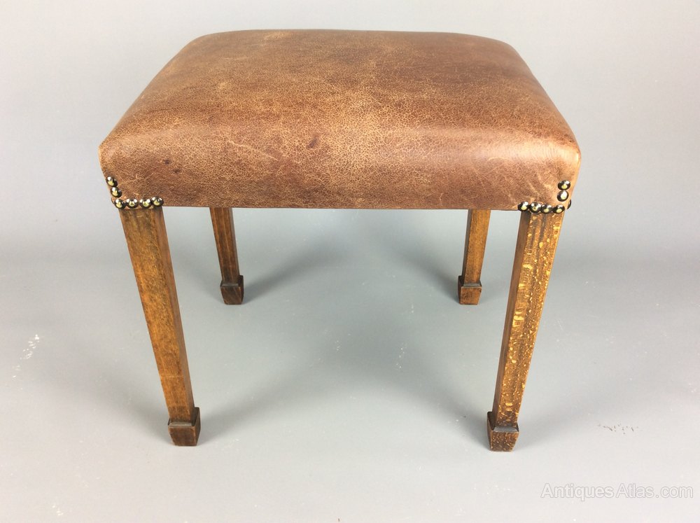 Arts and Crafts walnut stool with newly upholstered leather studded seat. All joints are solid, in good condition.
