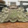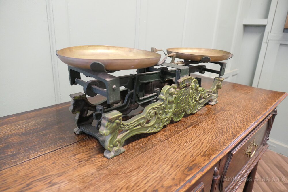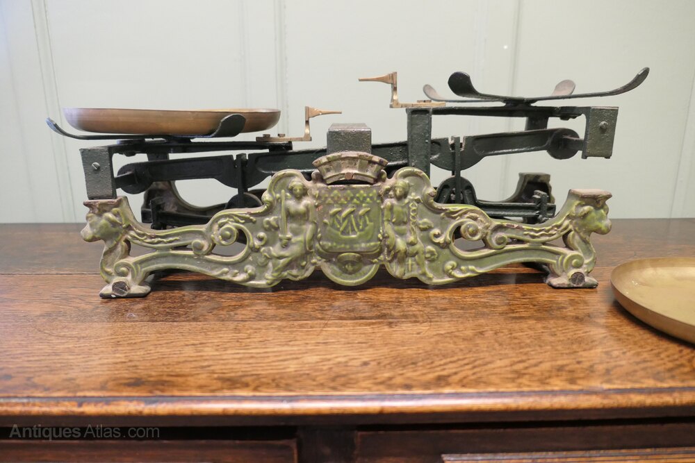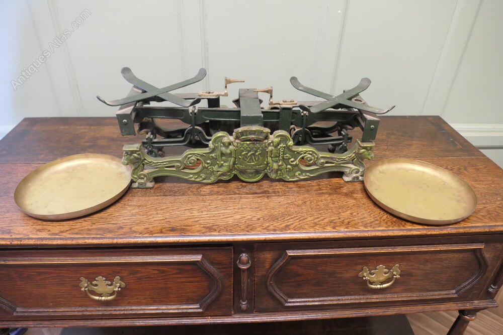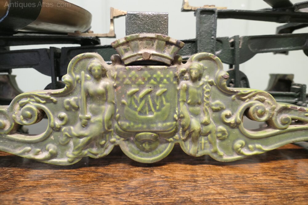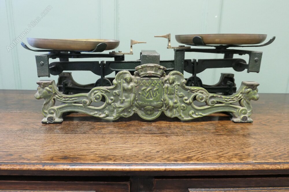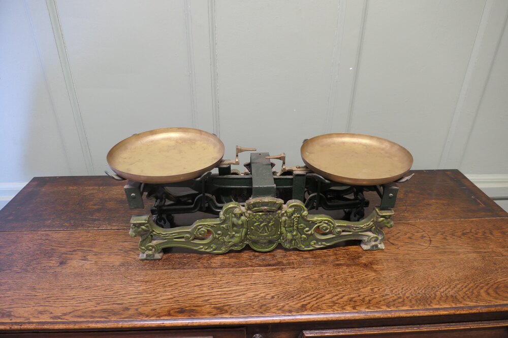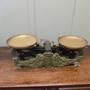 The scale has 2 brass pans, the body of the scale is very decorative in green enamel