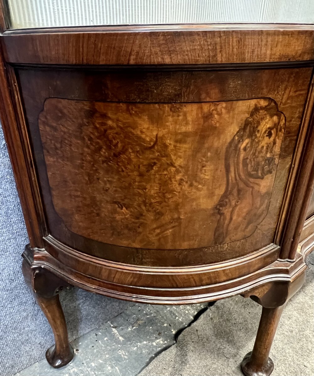 An attractive and good quality walnut and burr walnut display cabinet. The cornice having a moulded top following the breakfront form with bowed ends and carved patrae. The centred door having subtle astragal glazing bars and opens to the 2 plate glass shelves, silk backing and electric spot lights in the top. Below is a burr walnut panel within straight grain walnut cross banding and conforming bowed ends. The stiles have cluster columns with carved wheat ear decoration and the whole raised on 4 shaped legs with pad feet. Condition- very good with working lock and key. Dimensions:- Height…70’’/ 179cm. Width…57’’/ 145cm. Depth…15.5’’/ 39.5cm. Delivery by 2 men to most of U.K. mainland £75.