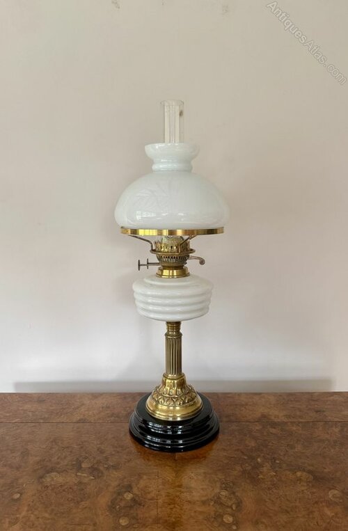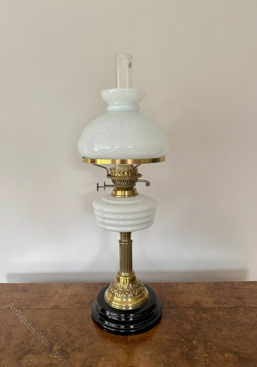 Attractive quality antique Edwardian oil lamp having the original white glass shade, a double brass burner above a white glass reservoir supported by a brass column raised on a ornate brass circular base mounted on a black base.