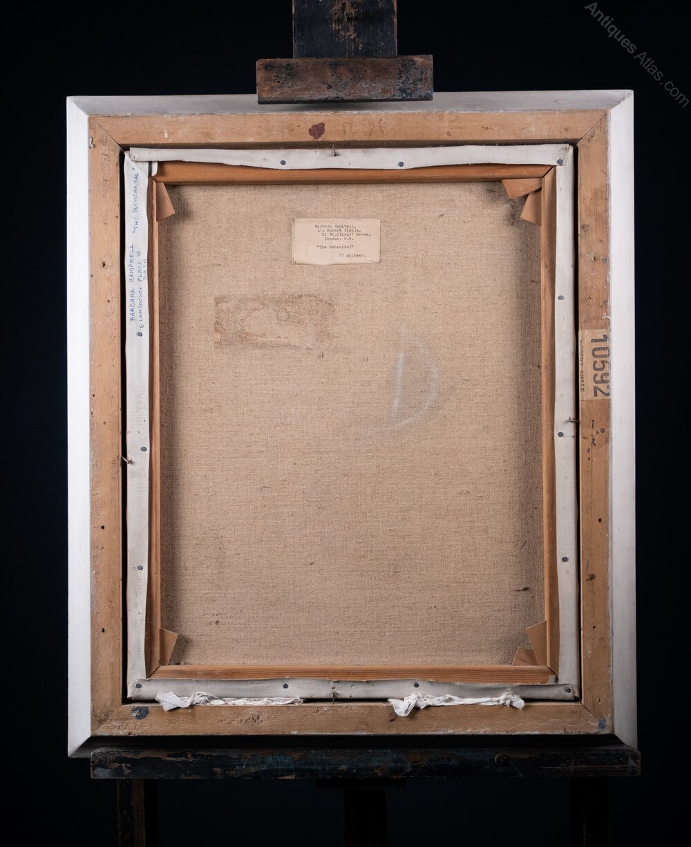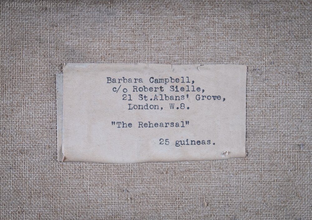 'The Rehearsal' by Barbara Campbell. Unfortunately we have been unable to find any information regarding the artist herself. The label verso, 'Barbara Campbell, c/o Robert Sielle...', does help us date the work however.