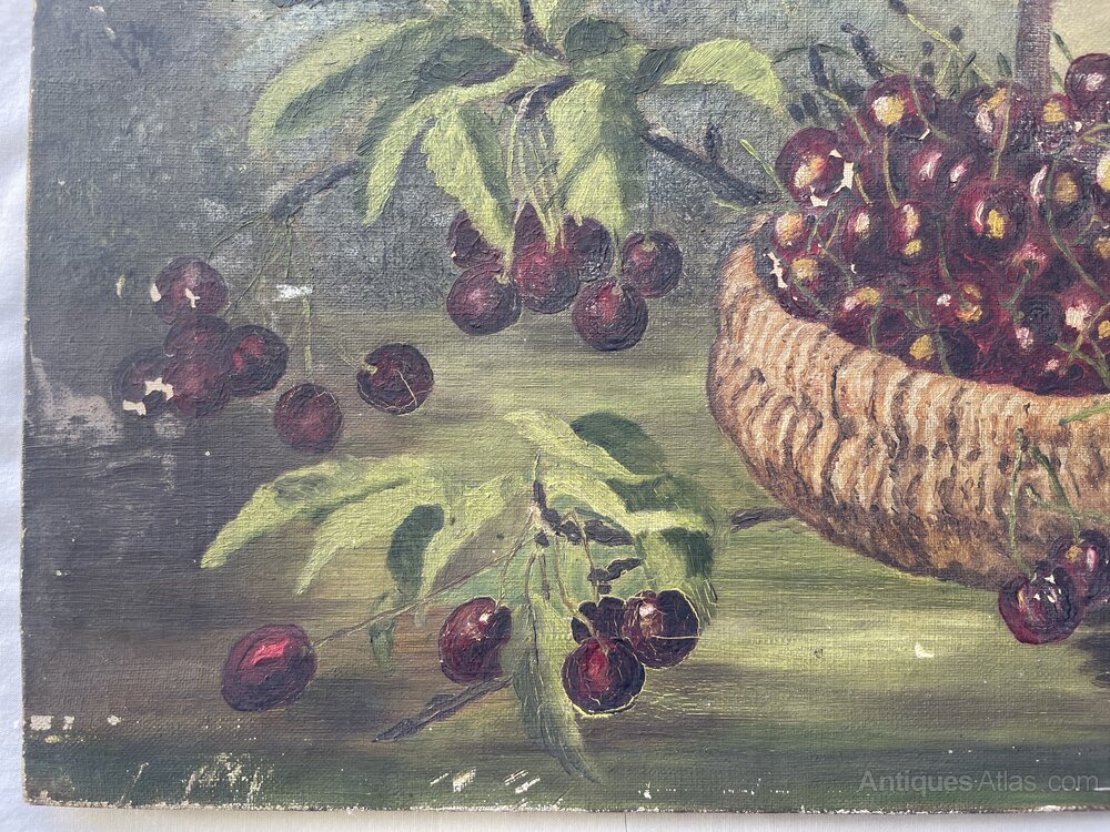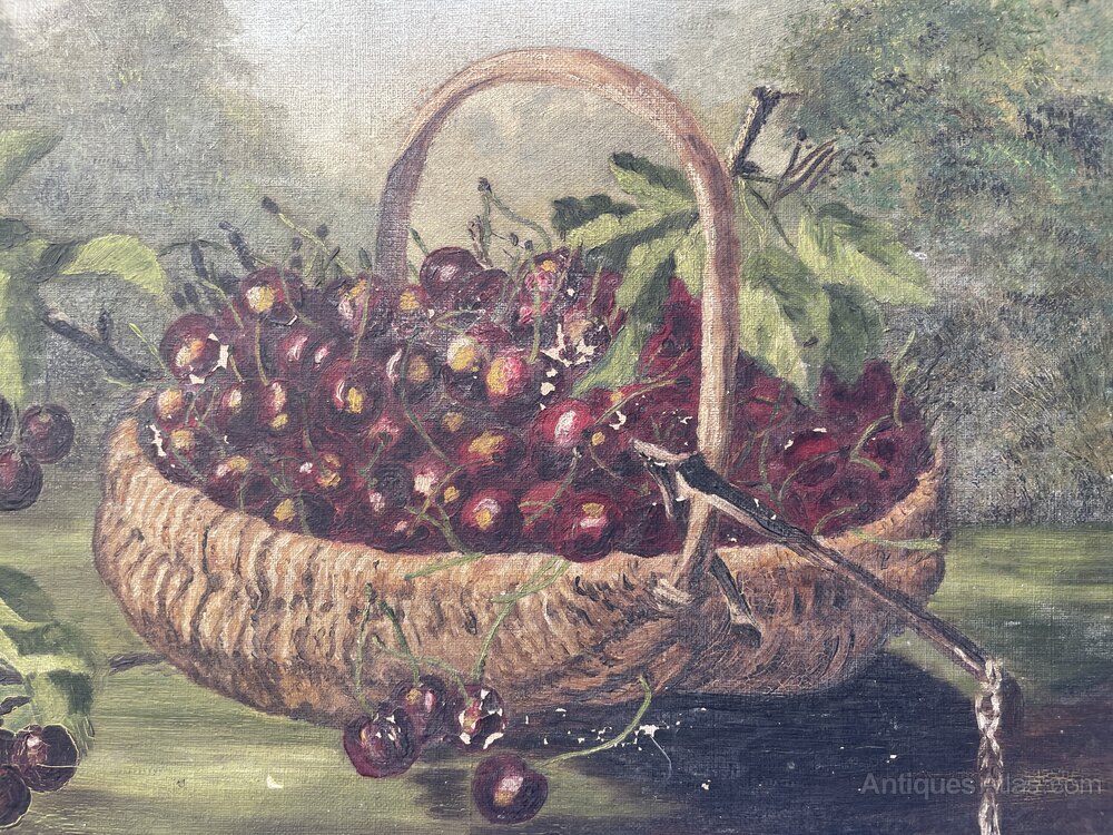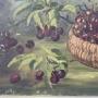 A very attractive original still life painting of cherries in a basket in the landscape. The painting is signed with initials that look to be J.J and is dated 1909, though the last number is could be a different digit.