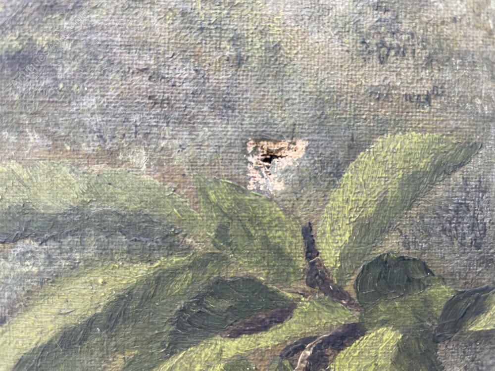 The condition is fair. There are some condition issues with it as can be seen from the photos. There is a puncture middle left with associated paint loss. There are a number of further small areas of paint loss across the painting. The painting would benefit from a clean.