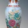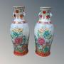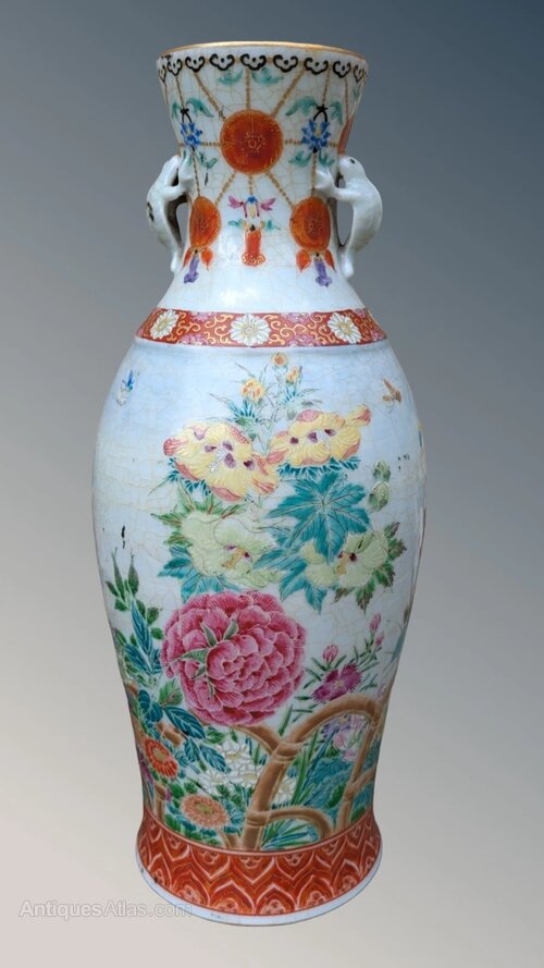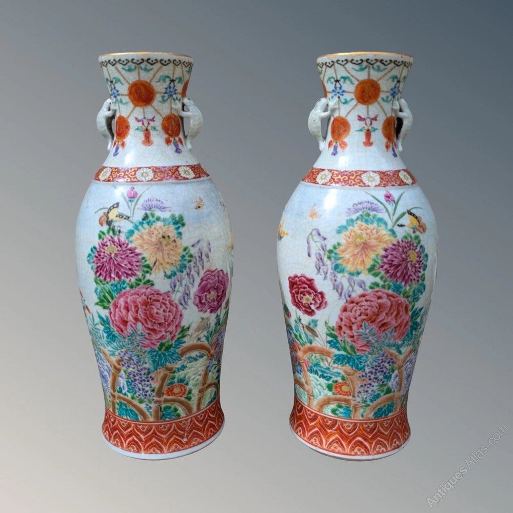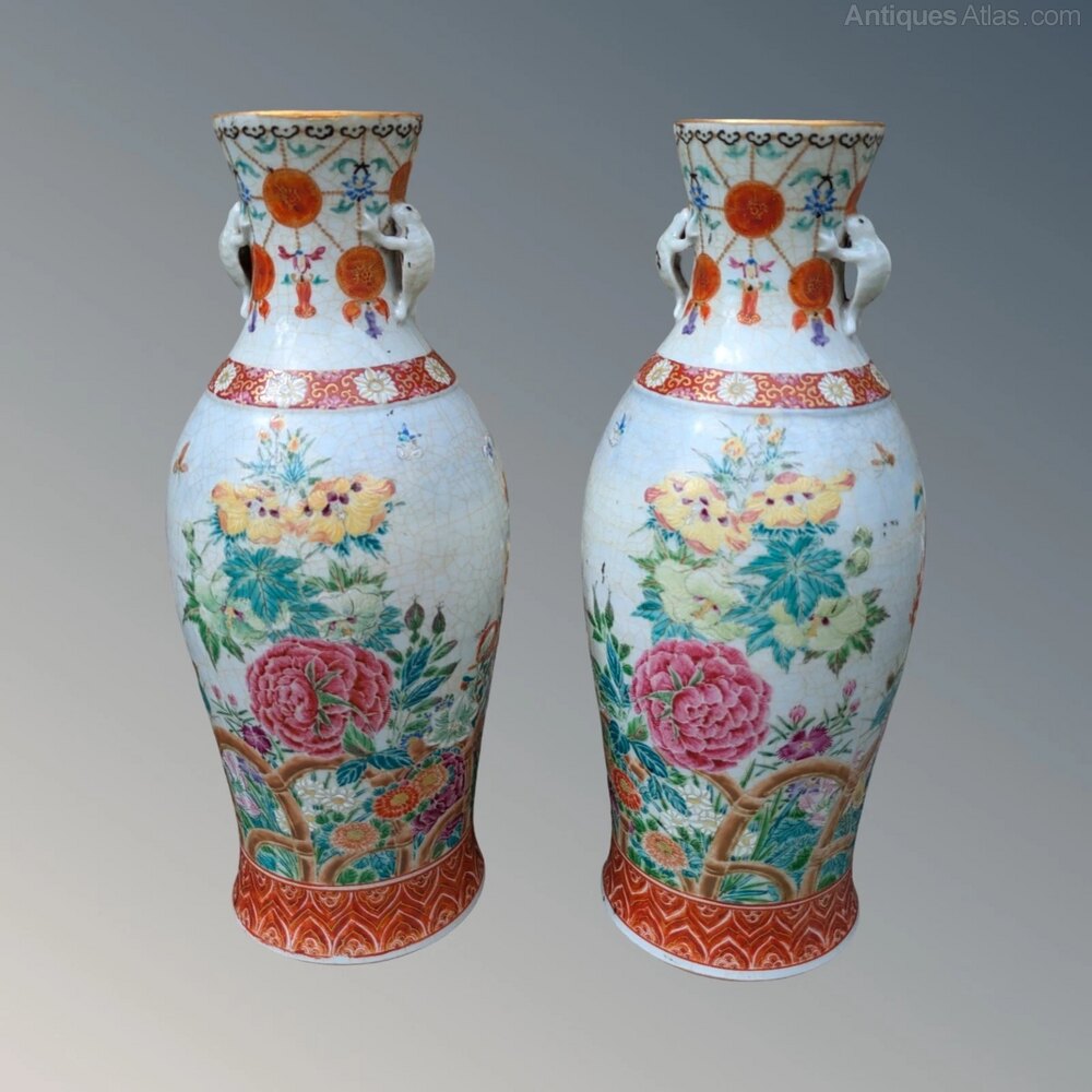 The vases are Meiji period circa 1890 and are boldly decorated with typical ironstone borders and wonderful blooms of peonies and chrysanthemum growing behind an arched bamboo trellis.