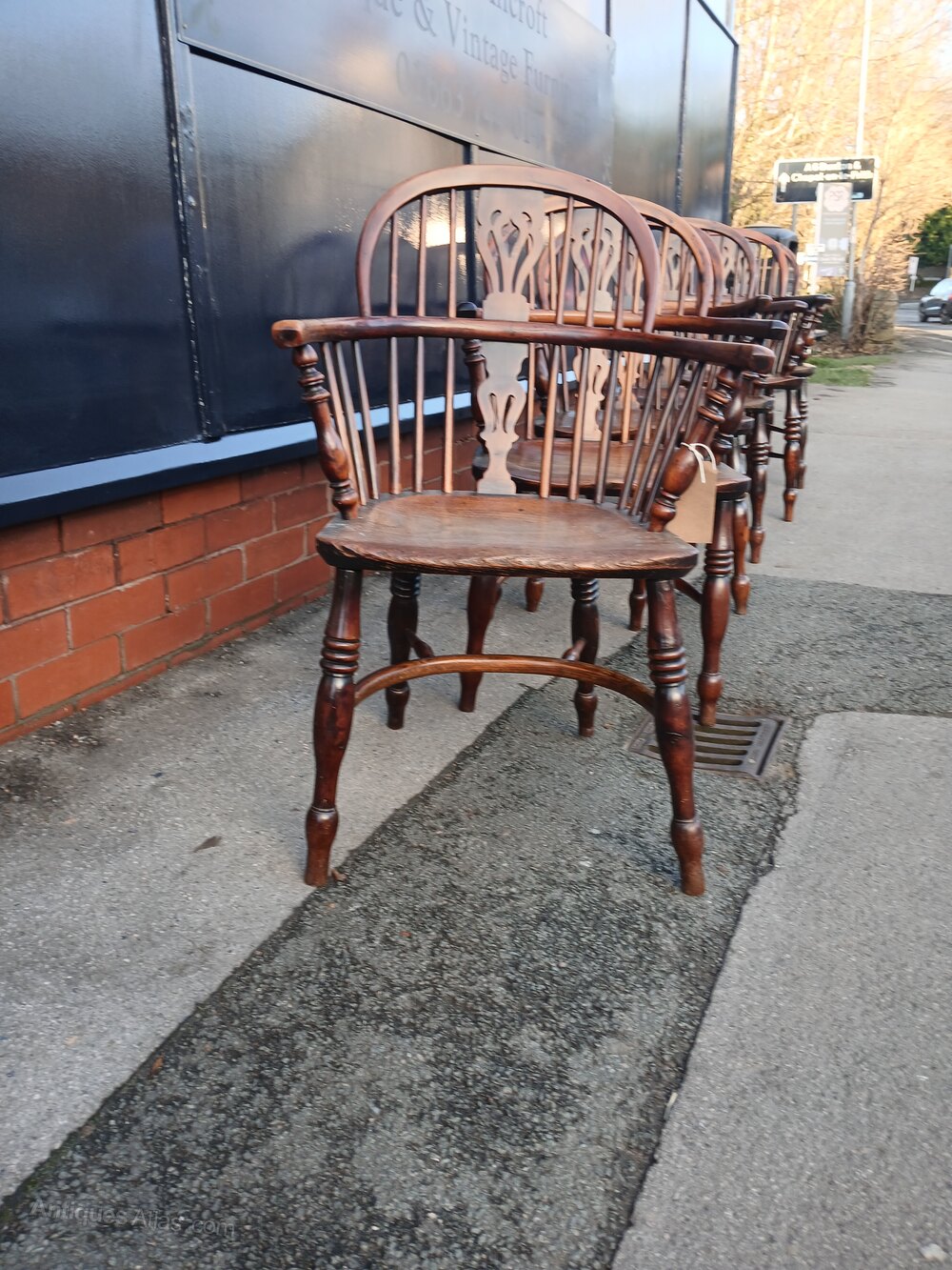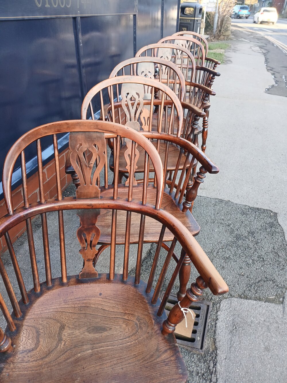 Stunning rare set of 6 English Yew wood Windsor chairs, circa 1830.