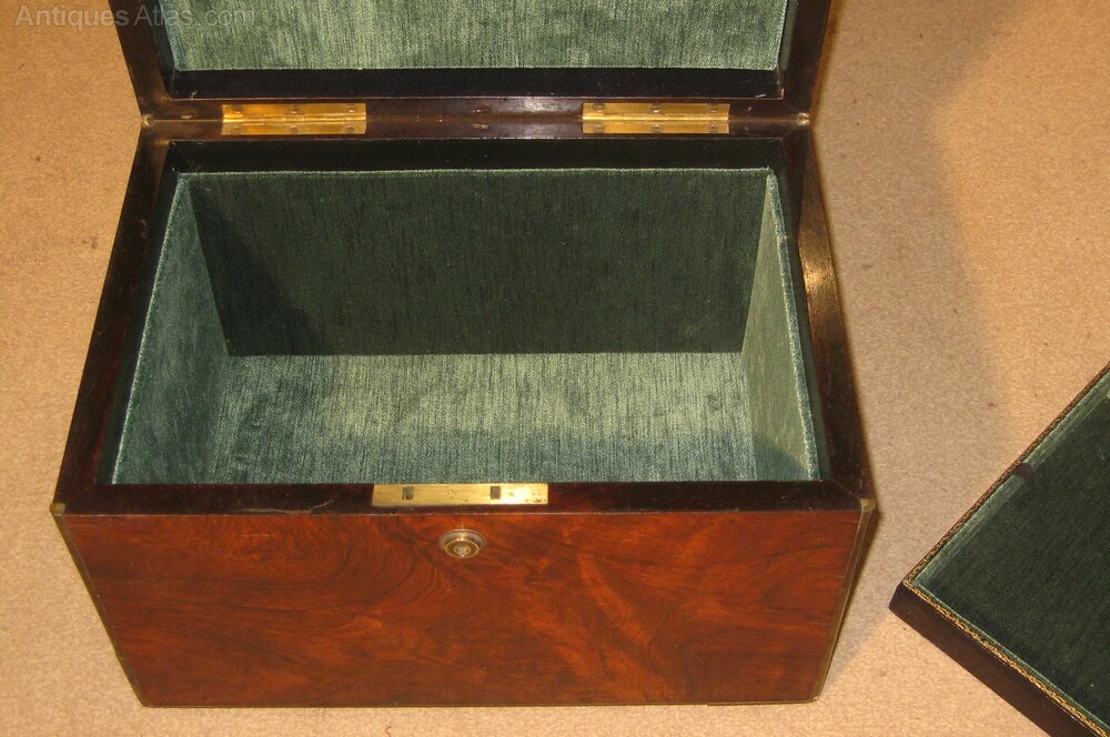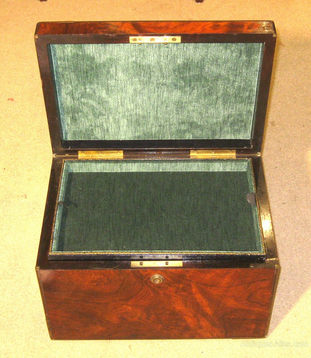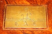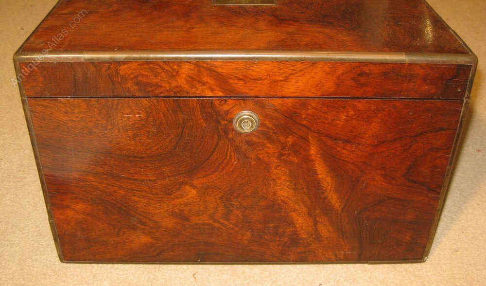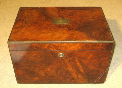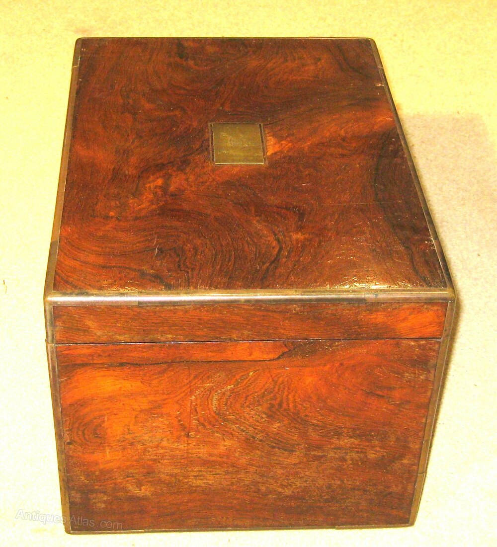 Beautiful Victorian rosewood jewellery / trinket box with lift out tray. With brass protective corners and Bramah lock. The top with a brass plate engraved with the figure of a Roman (?) gentleman and the initials ‘C.A.L.’ (?)