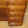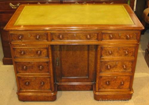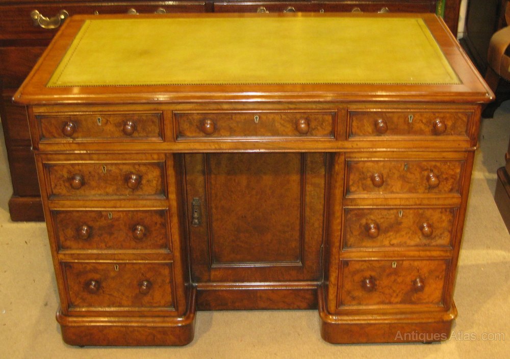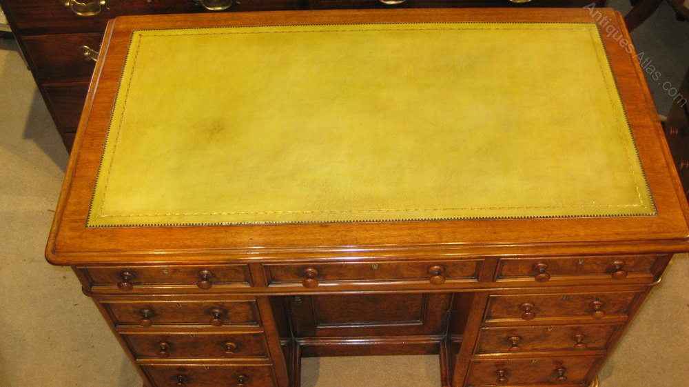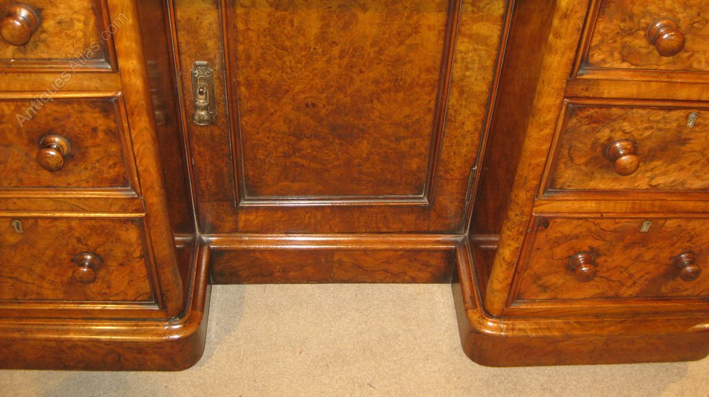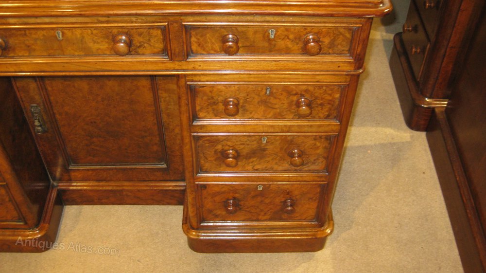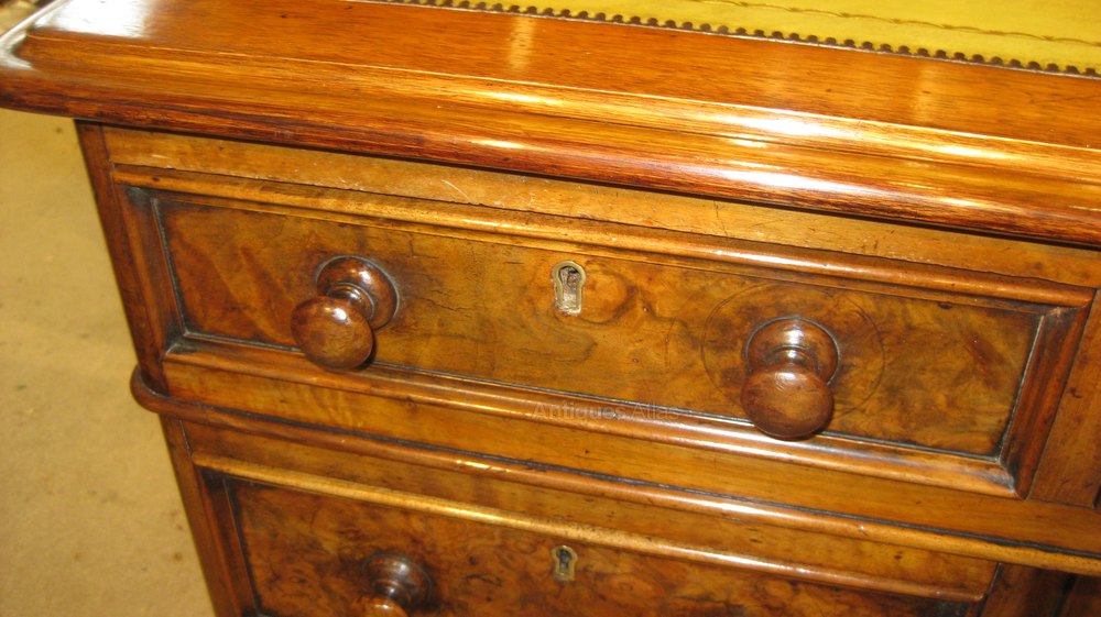 Beautifully grained Victorian burr walnut kneehole desk. The nine drawers of a fine, hand cut, dovetailed construction with mahogany linings, turned knob handles and working locks to all drawers. With a lovely panelled back and a recessed central cupboard. With a new, full hide, leather top and standing on lovely old wooden wheel castors.