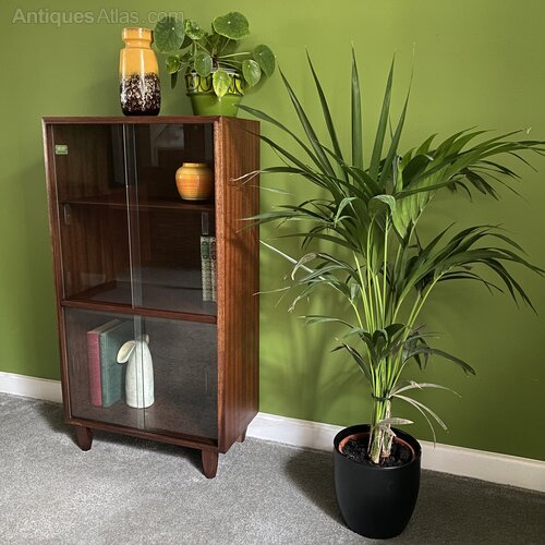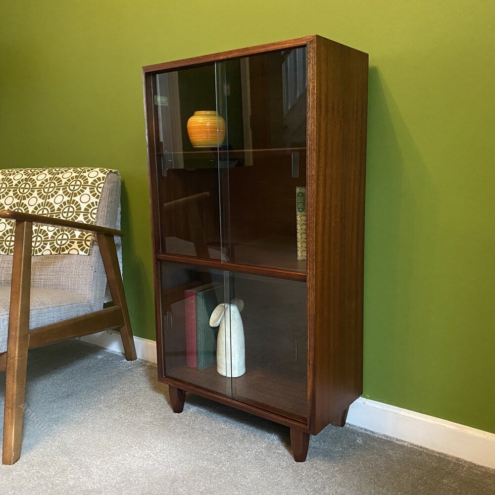 A simple and elegant mid century modern bookcase with 2 sets of sliding glass doors. Made by Beaver and Tapley as part of their 'Multi-Width' range, this is a petite cabinet in lovely medium-toned wood. The top section has an adjustable shelf resting on original brass supports and a shelf at the bottom. Underneath is a second section, also glazed there are 3 horizontal surfaces plus the top in total. The cabinet rests on original solid wood legs and is beautifully made.