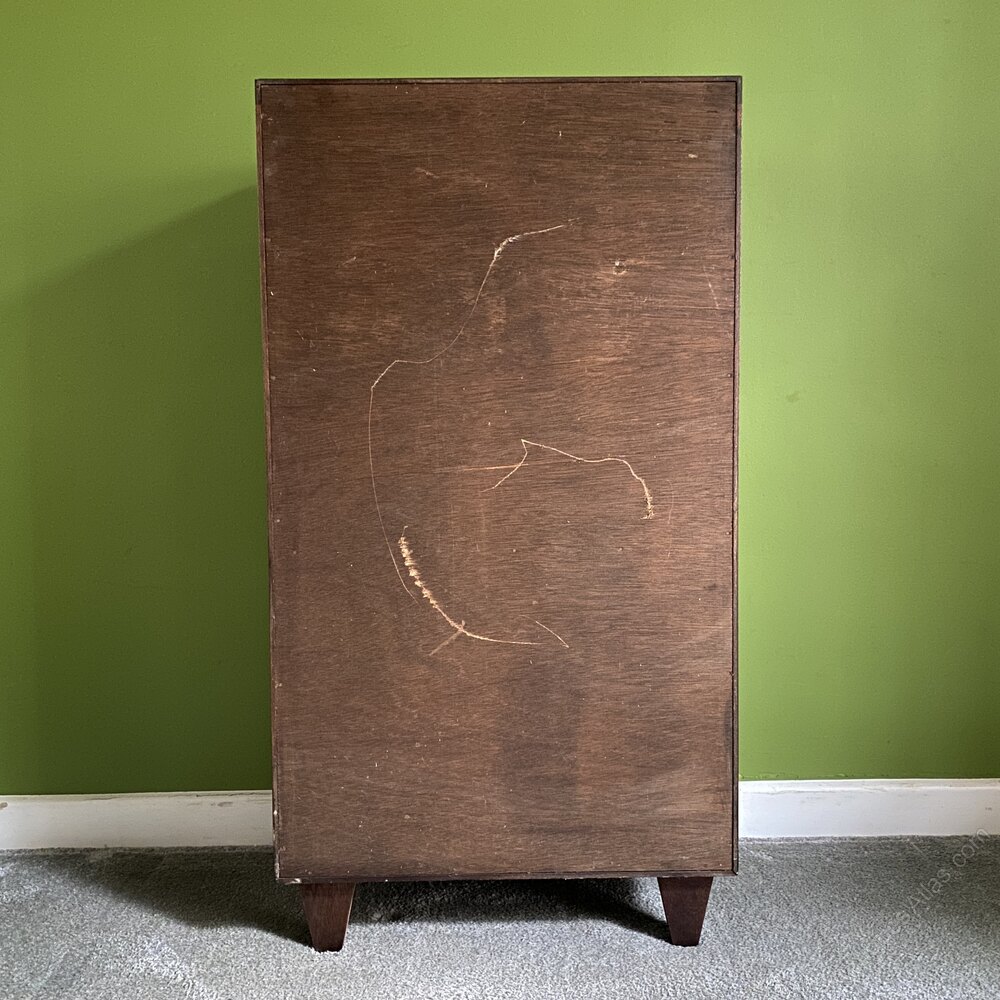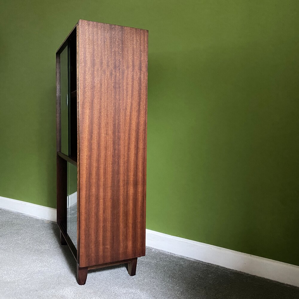 The cabinet has been fully restored the original dark finish has been removed to reveal the warm colour of the mahogany-type wood underneath. It has been oiled and finished with protective wax. There are minimal signs of use the wood has some tiny veneer chips on the side at the base, and there are scratches on the reverse. The original glass has a small chip (see last picture). The original 'Multi-Width' label remains. Please examine the photographs and feel free to ask us any questions, or request more pictures.