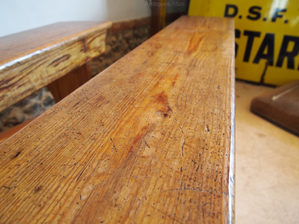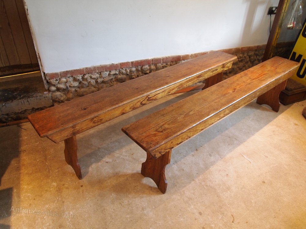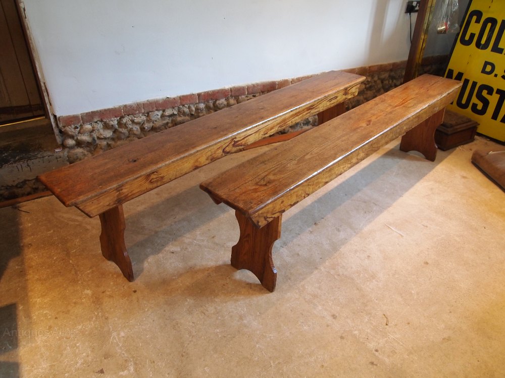 Here we ahve a fantastic pair of Victorian Pine benches from langley school c1895. As you can see the benches have great colour and patina. There are single plank tops with great grain and colour. There are well shaped supports and friezes to each sides. These benches formed part of the refectory antique furniture at Langley school Norfolk. A rare pair of period benches in great retail condition ready for yopur home. The dimensions are approx 72 in ches long 19 high and 10 deep.