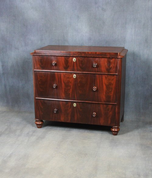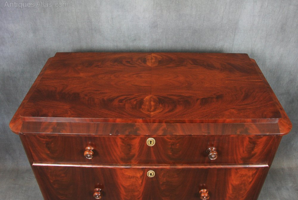 Fine quality Beidermeier mahogany chest of drawers of small proportions having quarter hatched figured veneered top with rounded corners over 3 long drawers with flamed mahogany fronts and rosewood handles all standing on turned bun front feet and block rear feet. c1840