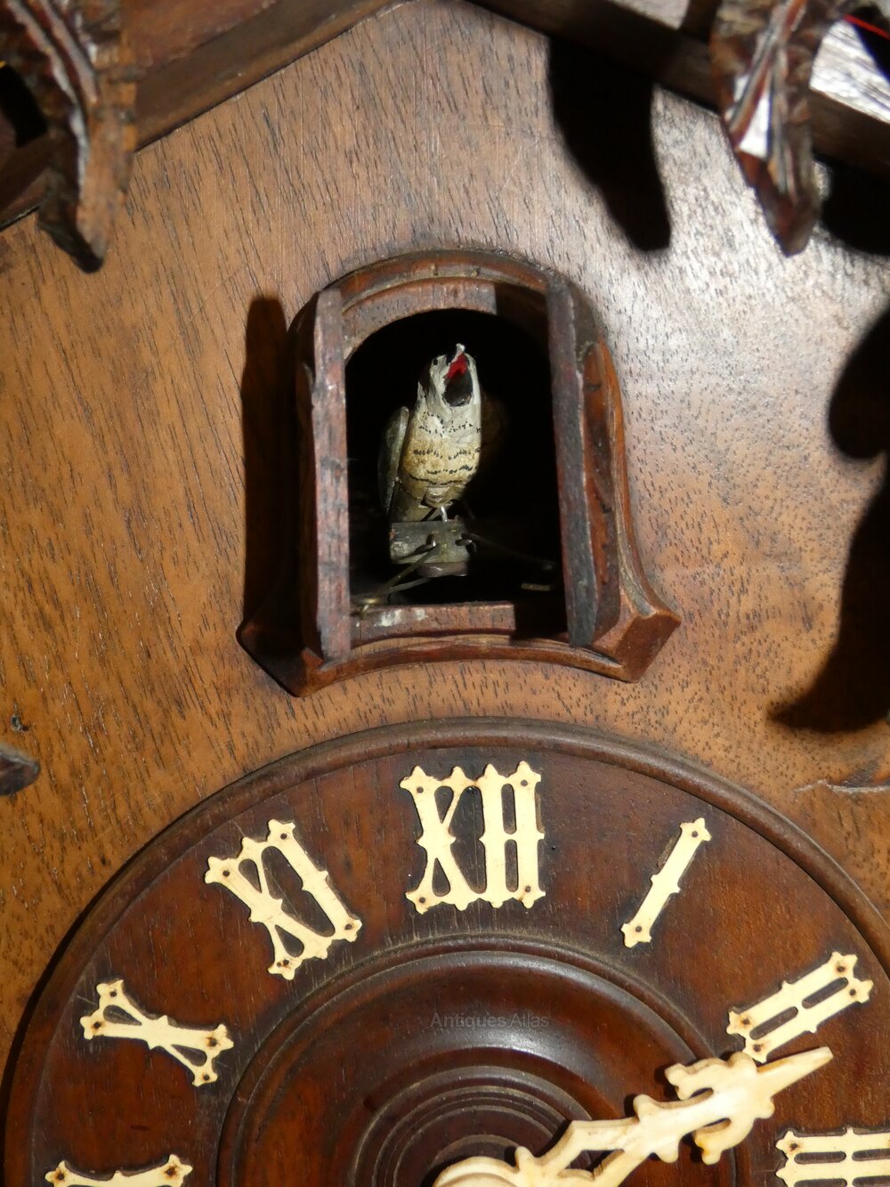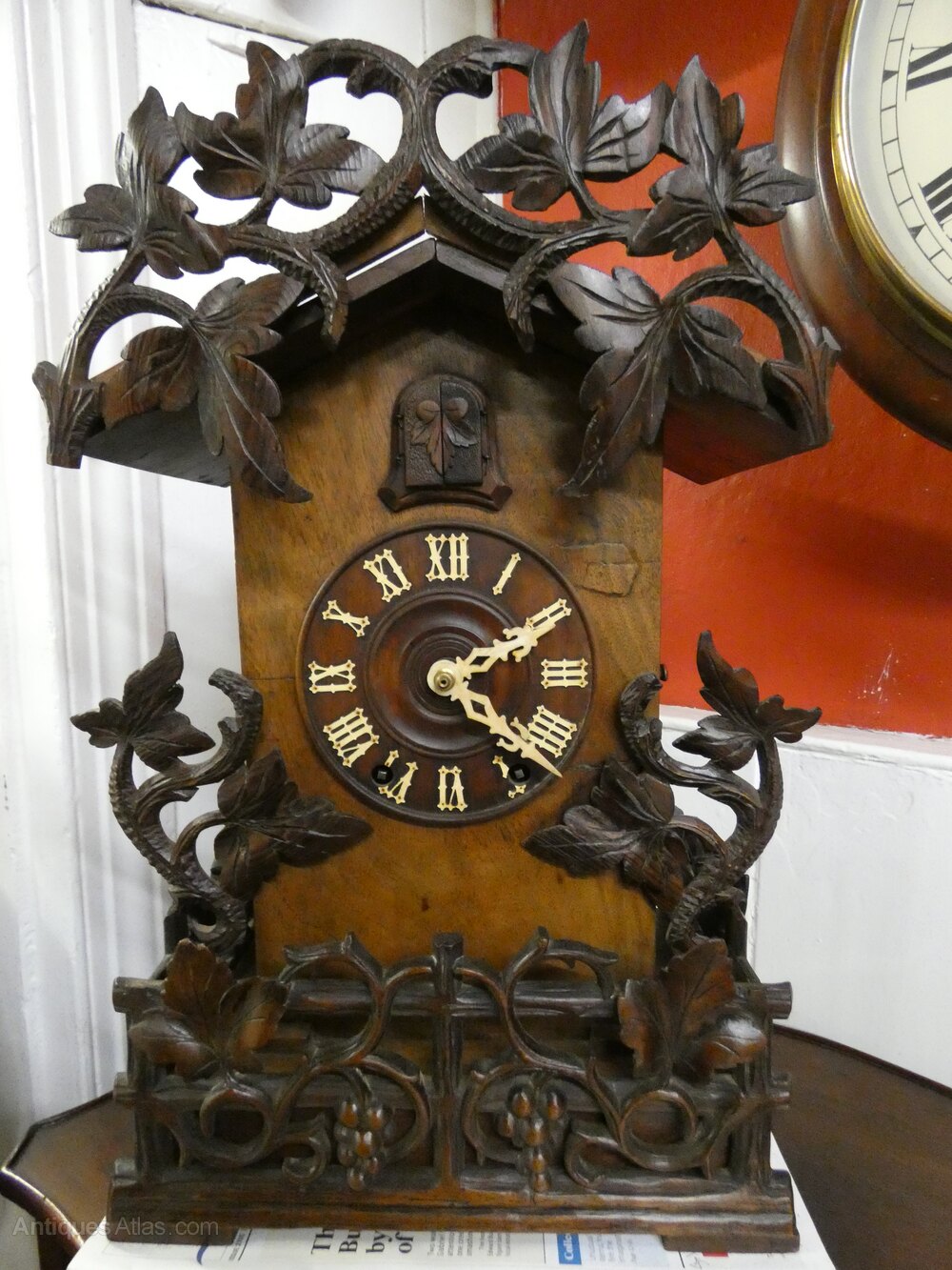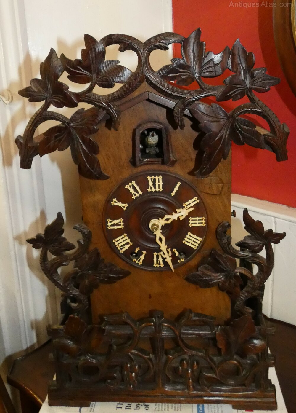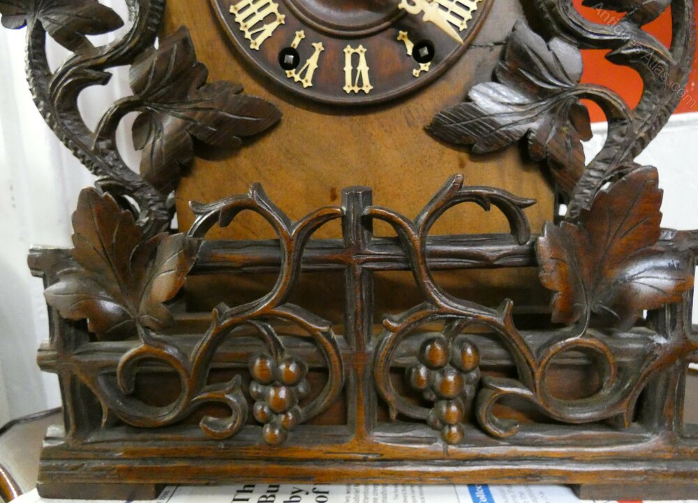 Charming Black Forest Cuckoo Clock, the case carved with fruiting vines, 5" dial and eight day movement striking on the hour and half hour.