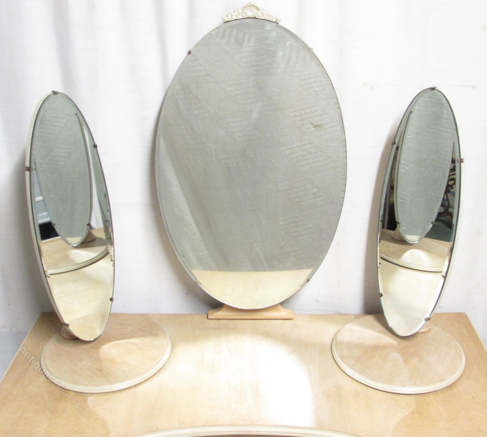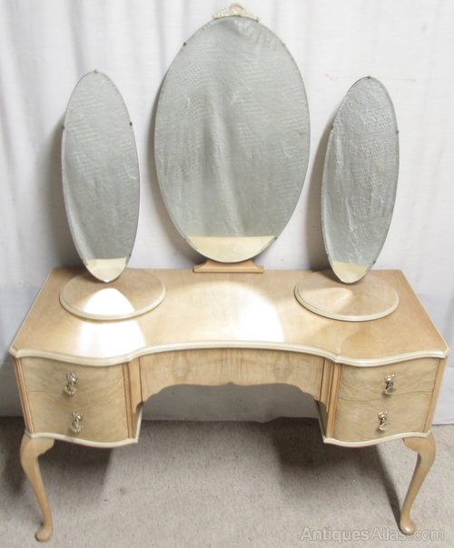 A lovely Walnut dressing Table dating to the 1920's, made from Walnut which is bleached and waxed. Really nice feature in the 3 mirrors, the central mirror rakes back and forth on a ratchet, they 2 outer mirrors swivel right round and their turntables so can be at any angle. The mirrors are all in good condition. All the drawers run smoothly and are fitted with original handles. She sits on Queen Anne legs.