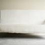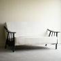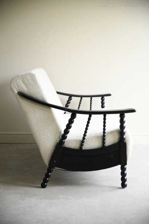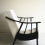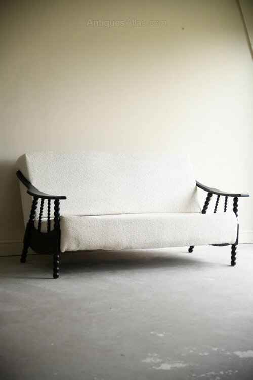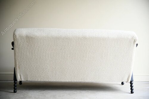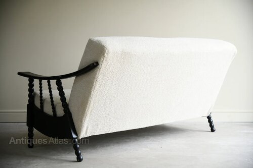 Boucle Upholstered Sofa. Vintage style sofa with a shaped back and seat upholstered in cream bouclé fabric, the ebonised frame with bobbin turned spindle supports and outswept arms, raised on turned legs.