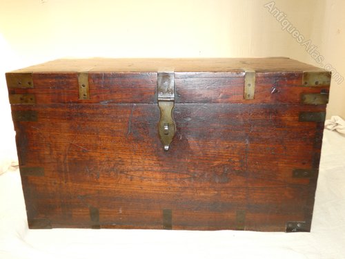 Teak military trunk with brass bindings and substantial heart shaped carrying handles to the sides.