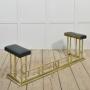 Brass club fender, the leather upholstered stools on square supports united by a plinth base.