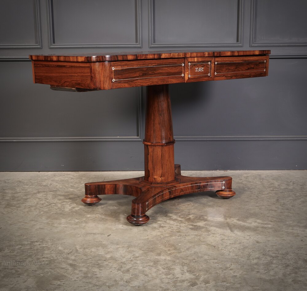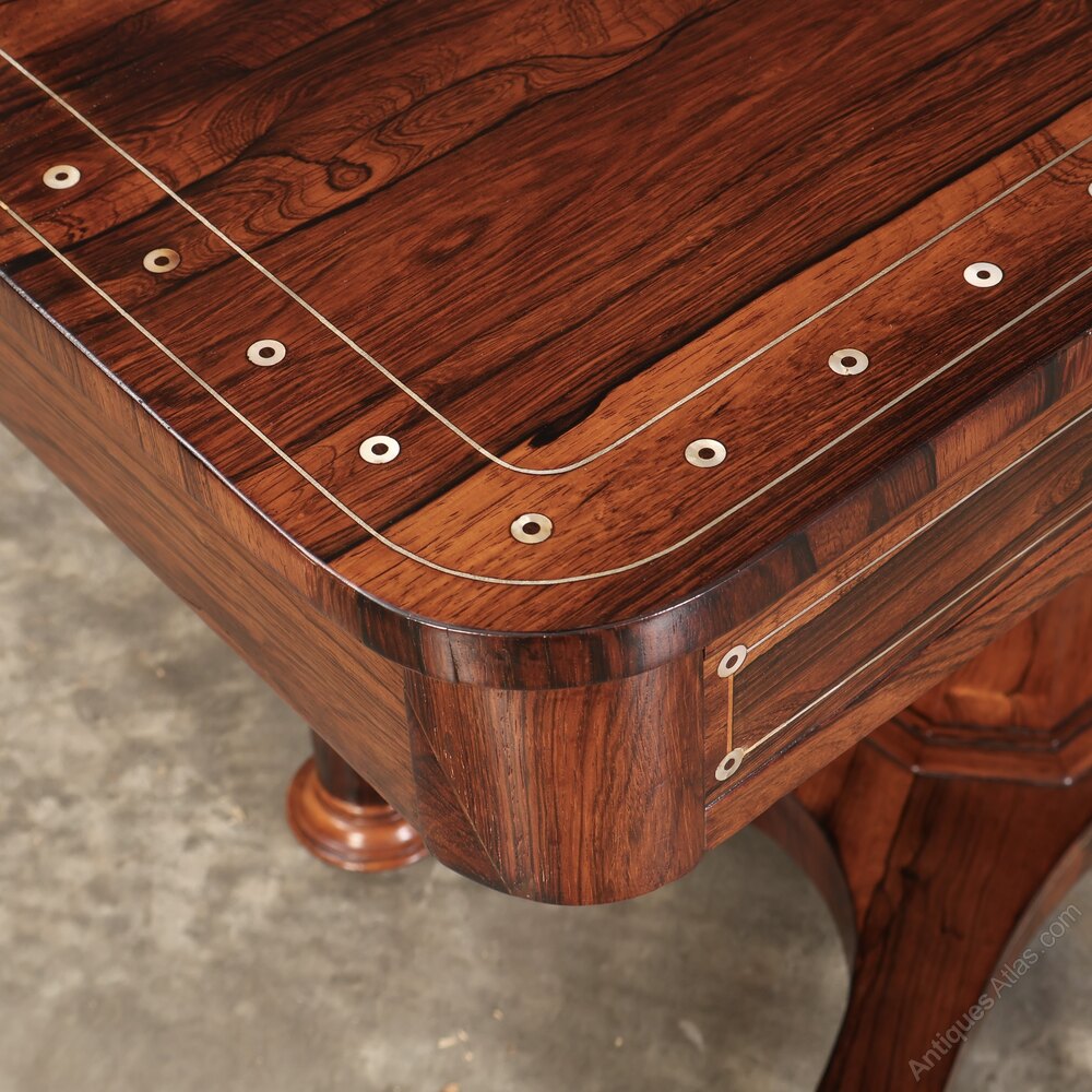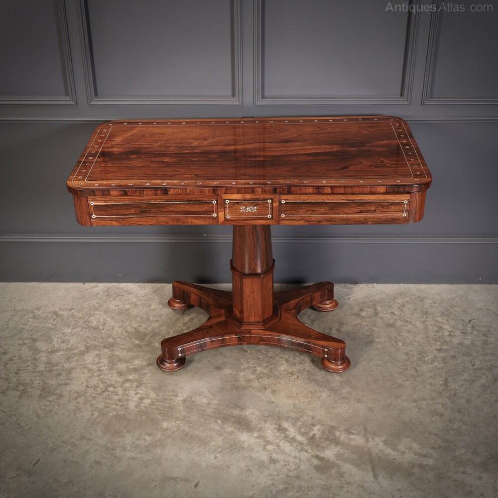 The richly figured rosewood top is decorated with fine brass string inlay and mother-of-pearl circles, finished all around so it can stand freely in the centre of a room.