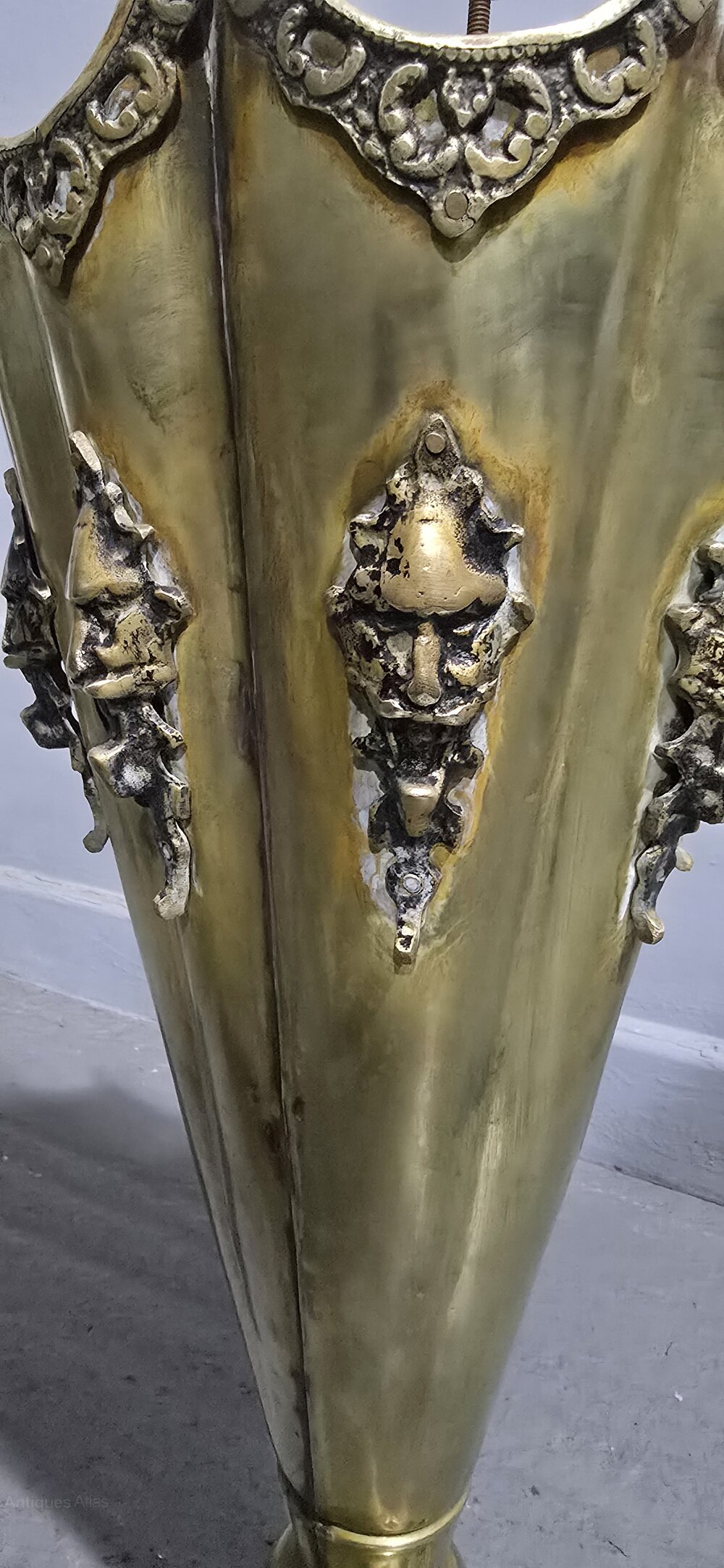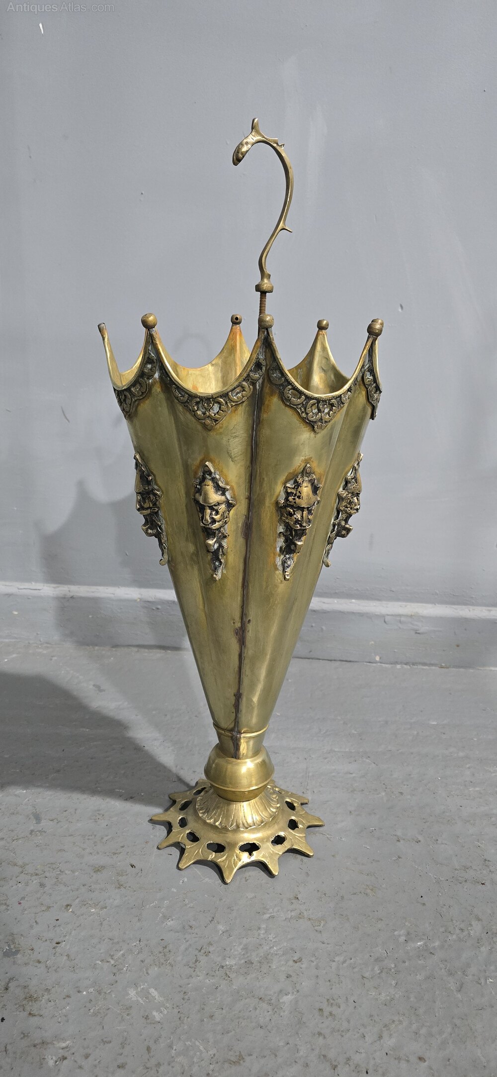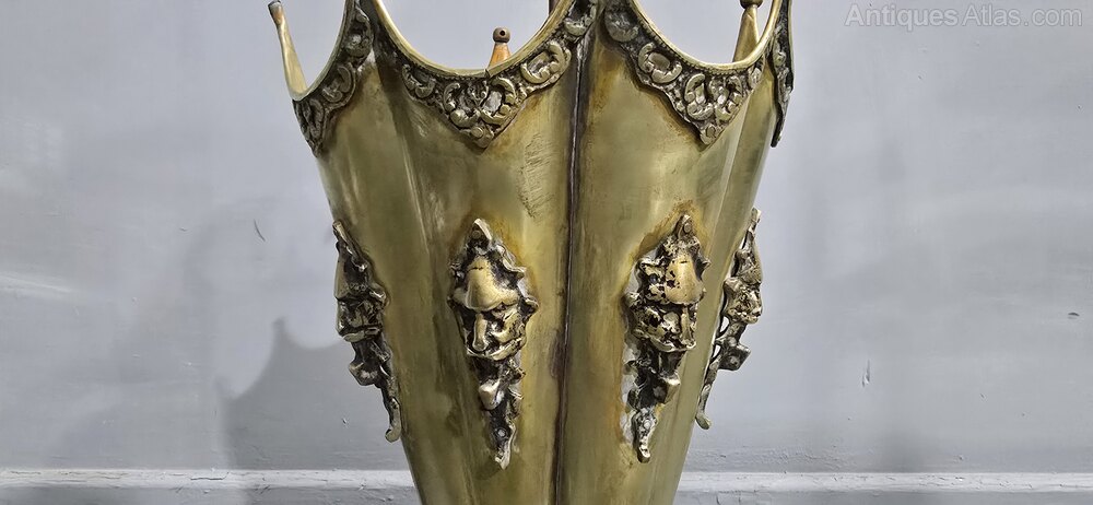 Brass umbrella stand with devil masks to the sides, overall great original condition.
