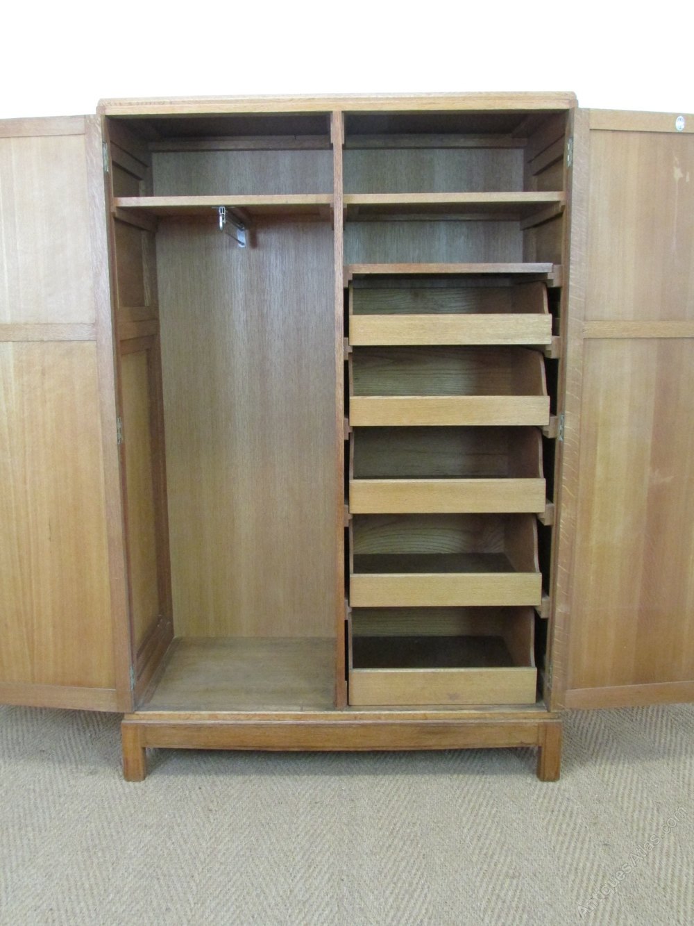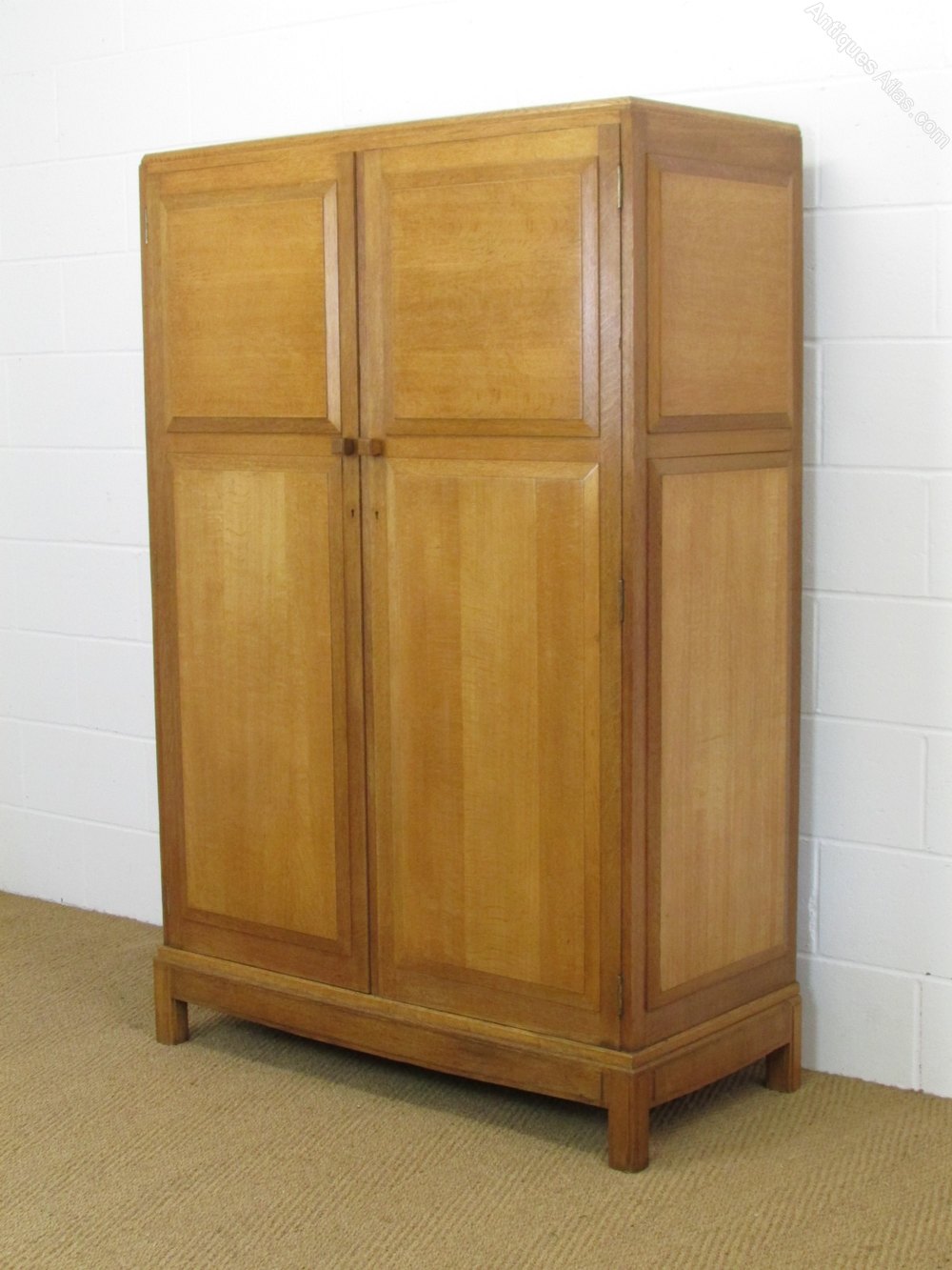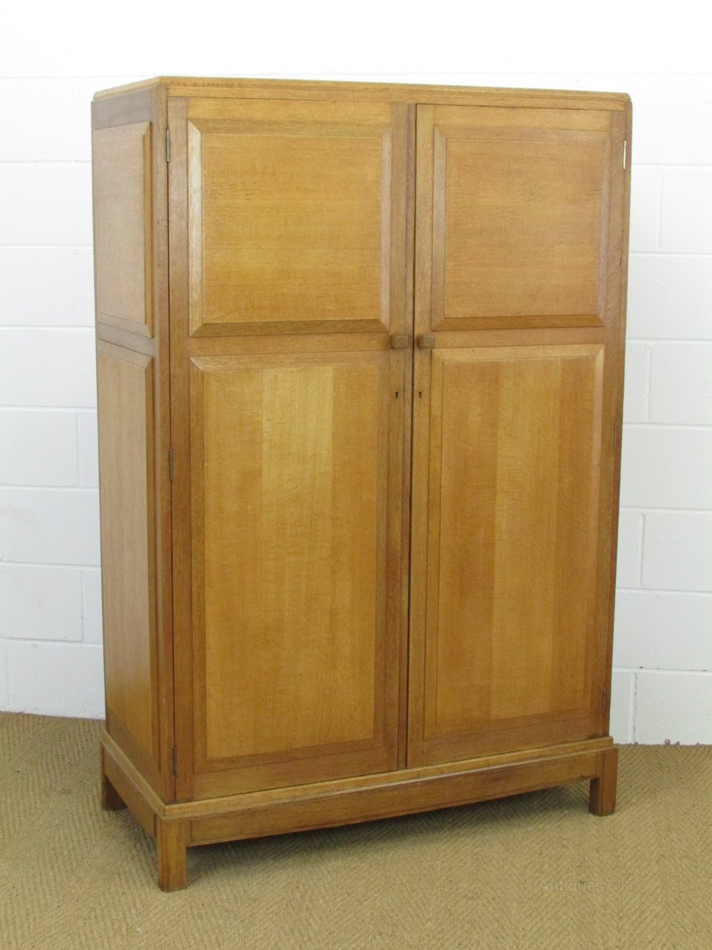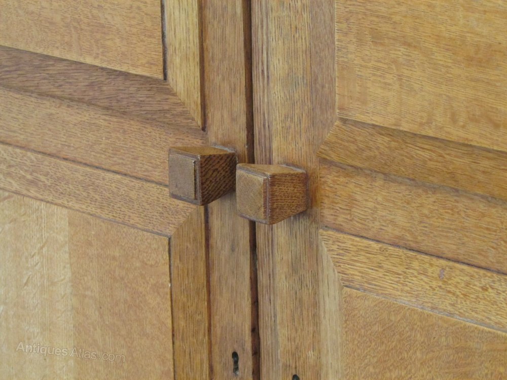 The wardrobe A Cotswold Style oak fitted wardrobe designed by Paul Matt for Brynmawr Furniture c.1930. Labelled. Constructed in ell figured quarter sawn oak. The wardrobe has distinctive bevelled panels to both the front and sides and square wedge shaped handles. Inside the wardrobe has shelving, a long flight of drawer slides and a hanging section.