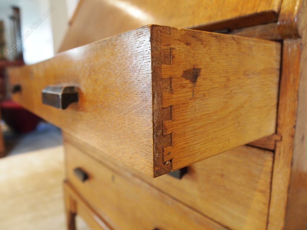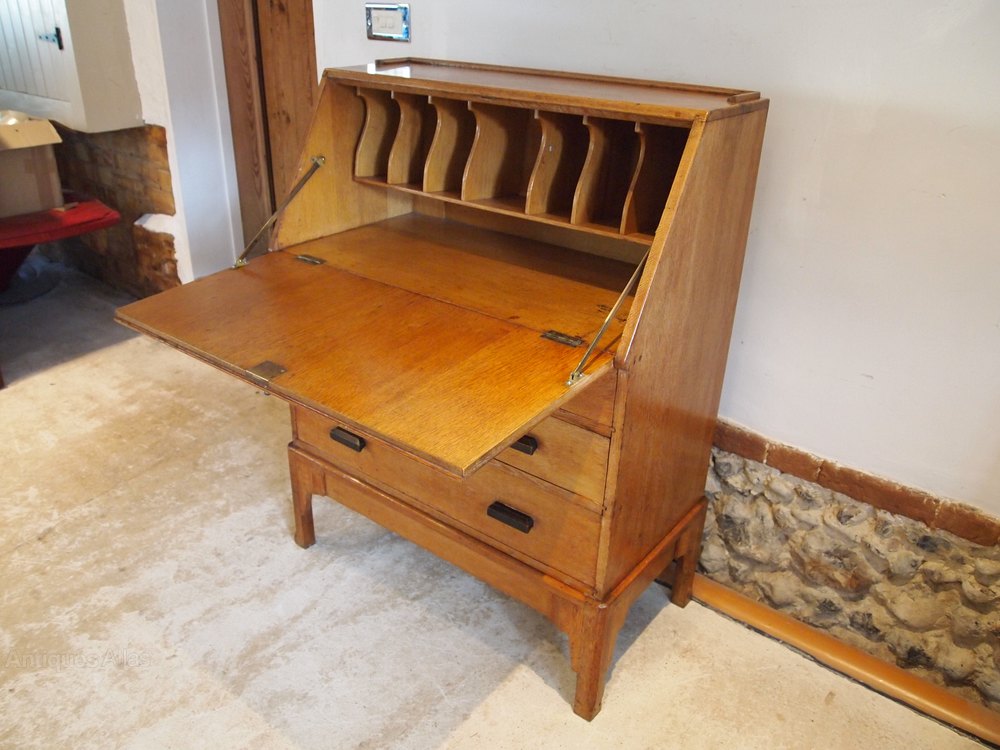 Here we have a wonderful limed Oak Art Deco bureau c1920. As you can see the bureau has great colour and patina. There is a beautiful angled moulding to the fall front and an original working lock and key. Internally there are pigeon holes and because the fall front is quite large it makes for a substantial work space. There are three solid Oak lined drawers with original Ebonised Oak handles. The whole sits on a wonderful bracketed footed base which is superbly executed with wonderful Art Deco angles. A super period bureau in great retail condition ready for your home. The dimensions are approx 81 cm wide 108 cm high 48 cm deep.