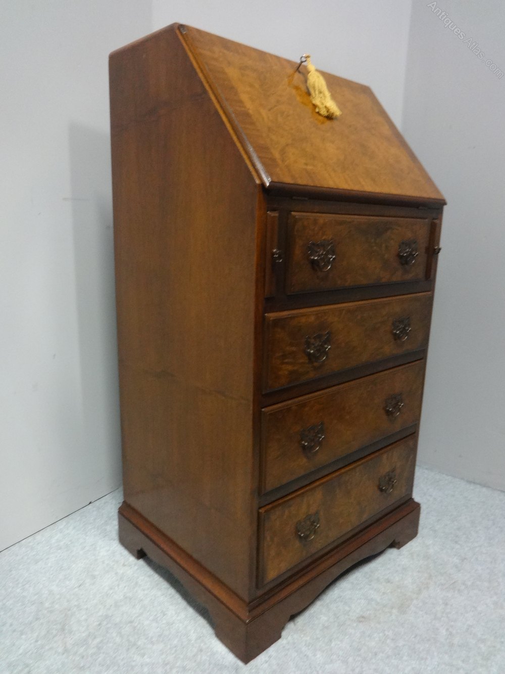 A good quality burr walnut bureau of small proportions, with brass handles, in excellent condition.