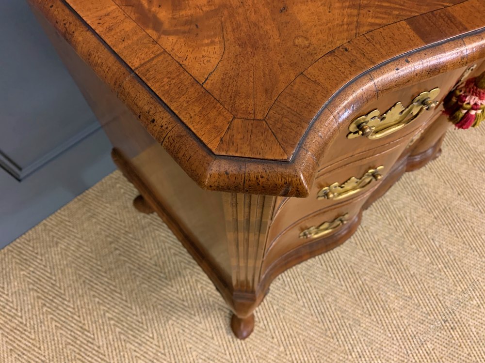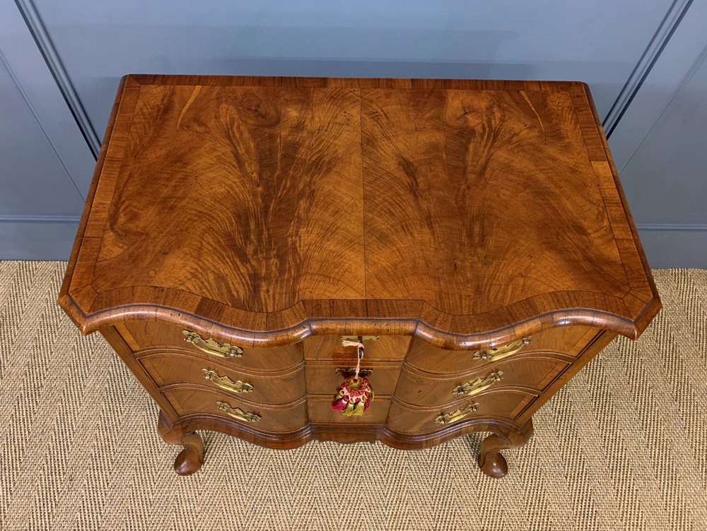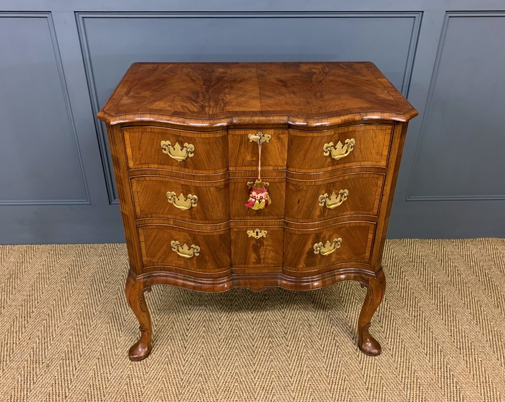The finest quality burr walnut chest of drawers by the renowned maker Charles Tozer of London. Of serpentine form and cross banded throughout. With a series of 3 graduated drawers fitted with their original solid brass hardware. With canted corners and standing on elegant cabriole legs terminating in pad feet. Sympathetically refinished in our workshops and now offered for sale in excellent condition with a wonderful colour and patina.