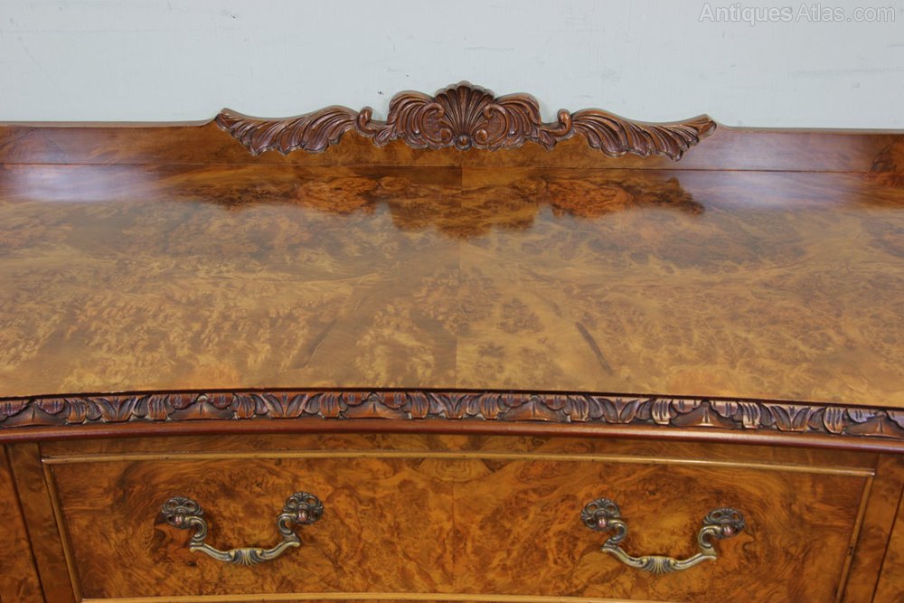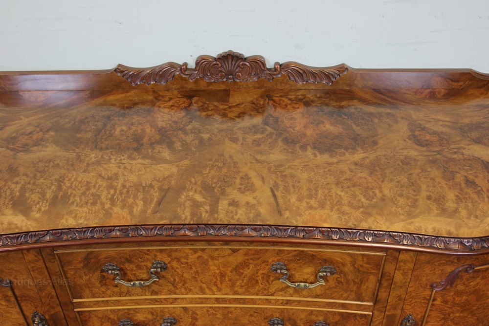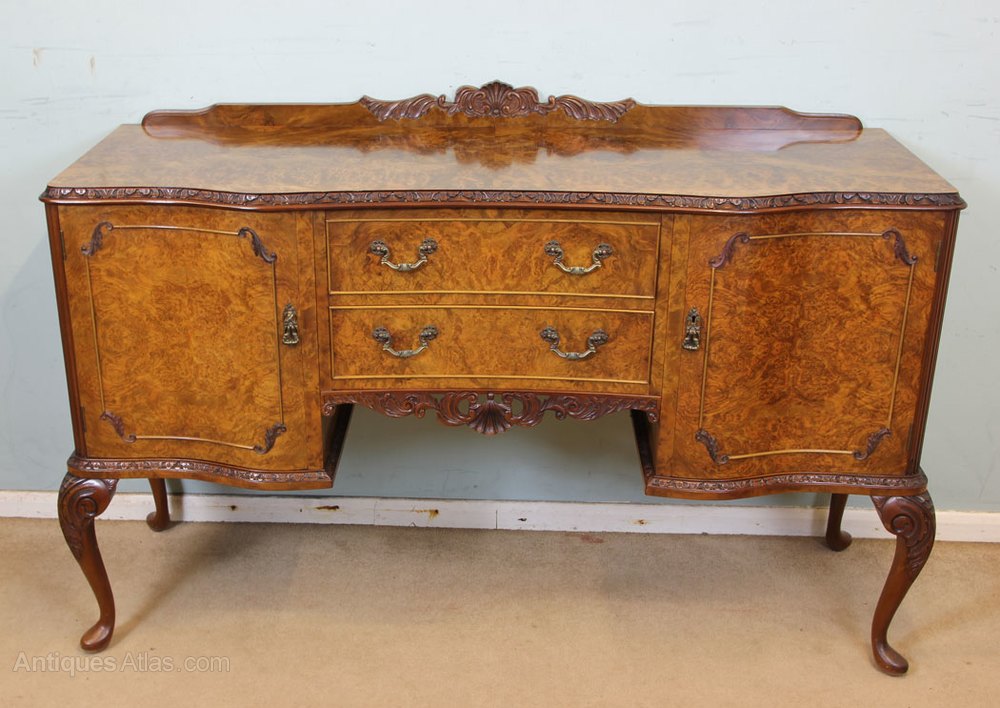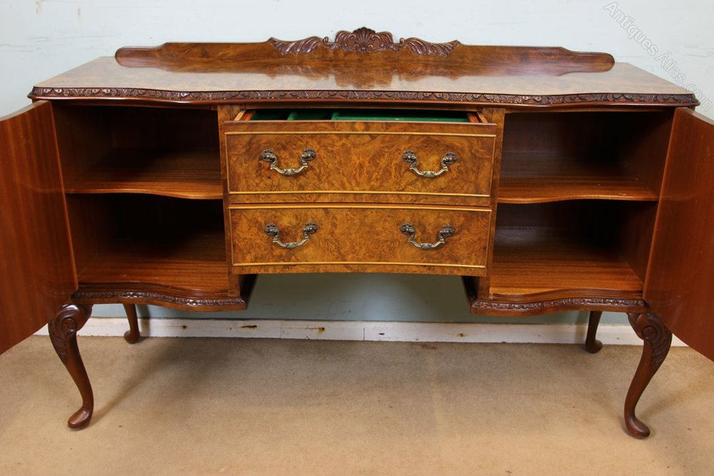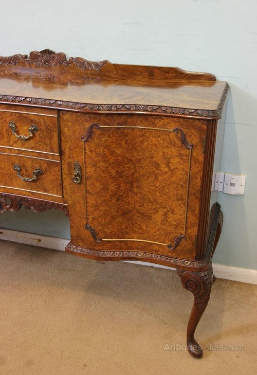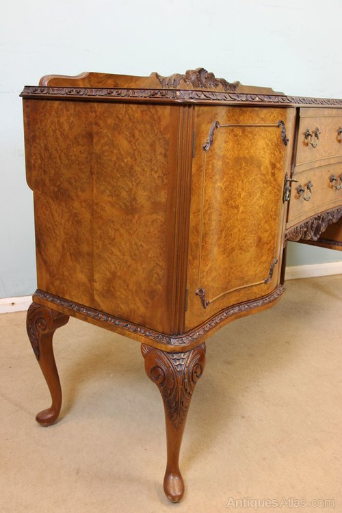 A Queen Anne Style burr walnut sideboard of serpentine shape. This 20th century sideboard has a shaped and carved low up stand to the back and has a lovely figured burr walnut top with a carved edge there is two drawers to the centre with a carved decorative piece under these are flanked either side by shaped cupboards all finished in burr walnut, fitted with brass decorative handles. The sideboard is supported by elegant carved scroll legs.